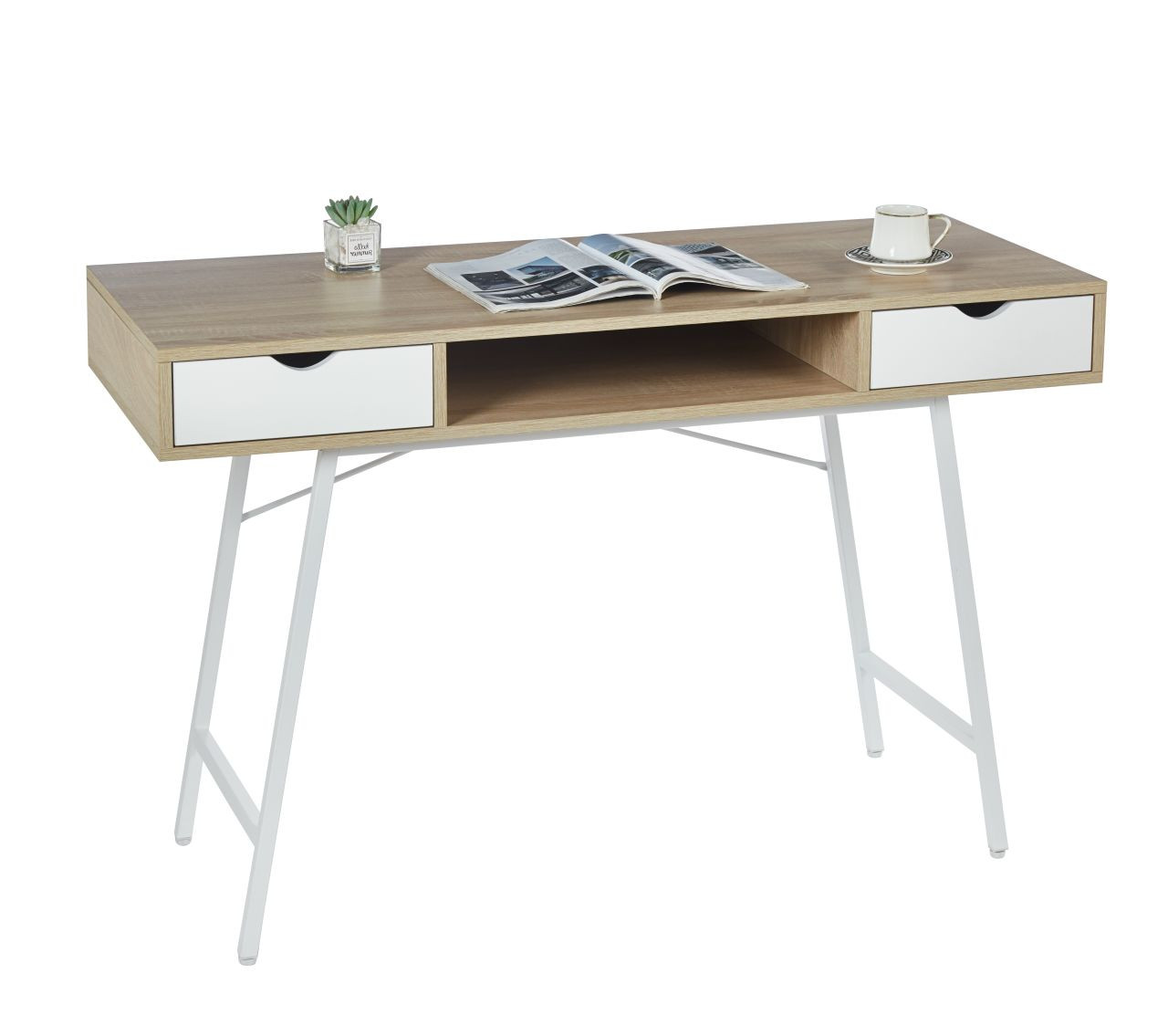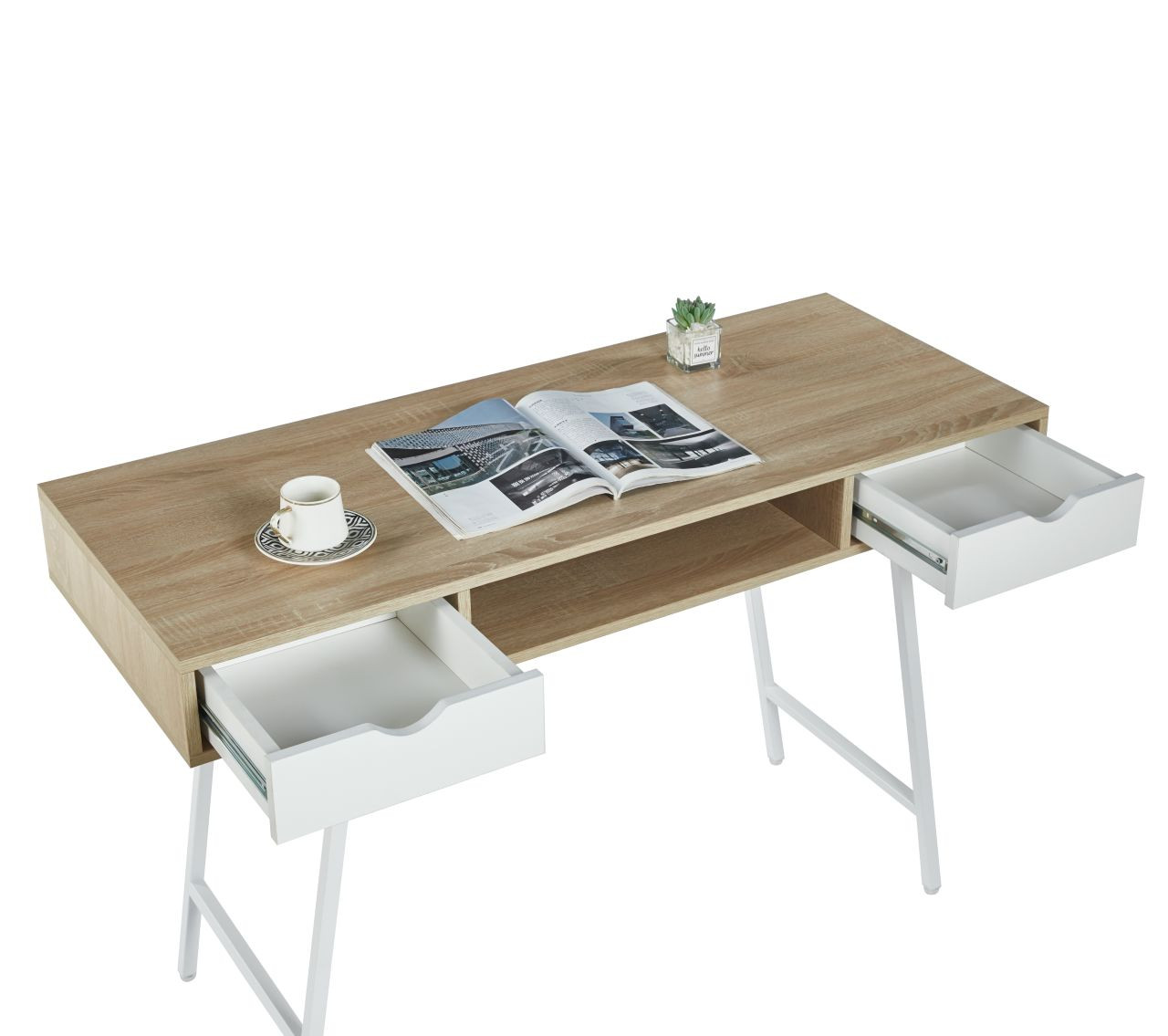 Ce modèle combine un plateau épuré, deux tiroirs latéraux et une niche centrale ouverte, idéale pour ranger cahiers, documents ou accessoires de bureau. Son piétement en métal thermolaqué blanc renforce la stabilité tout en soulignant son allure nordique.