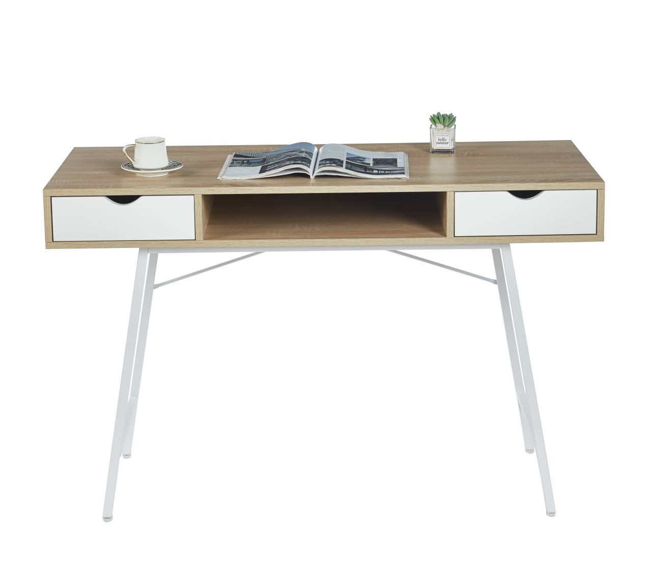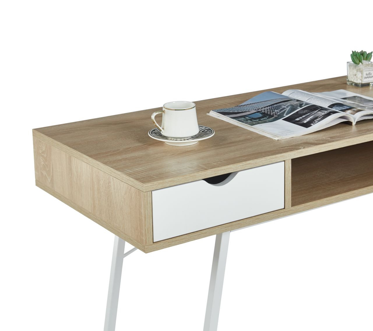Le bureau Golddeco aspect chêne Sonoma et blanc associe élégance et fonctionnalité. Compact et lumineux, il dispose de deux tiroirs latéraux et d’une niche centrale, parfait pour un espace de travail organisé dans un style scandinave moderne.