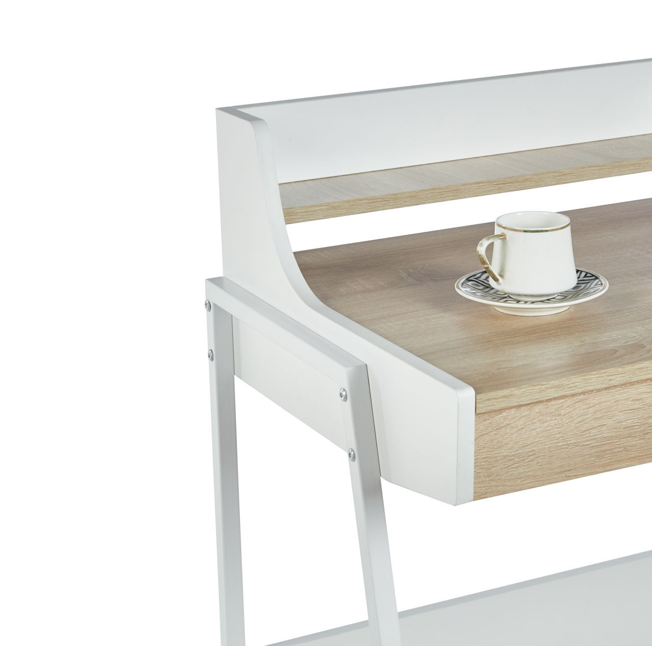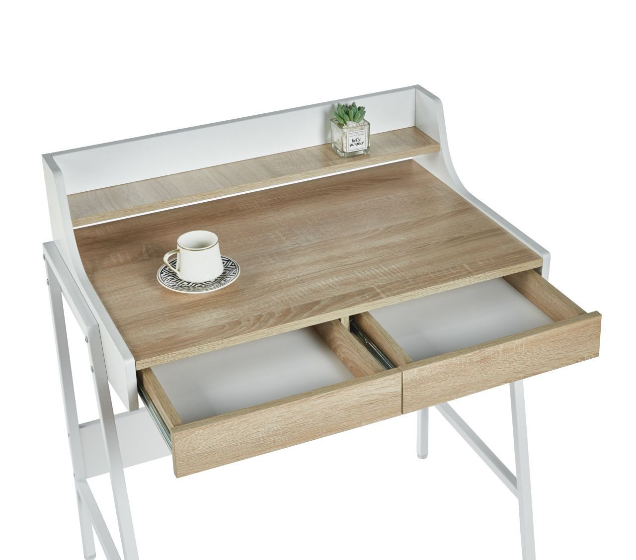 Le bureau Golddeco aspect chêne Sonoma et blanc associe chaleur du bois clair et pureté du blanc. Compact, élégant et fonctionnel, il dispose de deux tiroirs et d’une étagère pratique, idéal pour optimiser votre espace de travail.