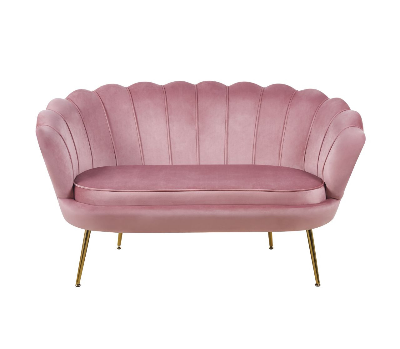 Le Canapé Coquillage Golddeco en velours rose et pieds dorés conjugue élégance et confort dans un esprit Art déco revisité.