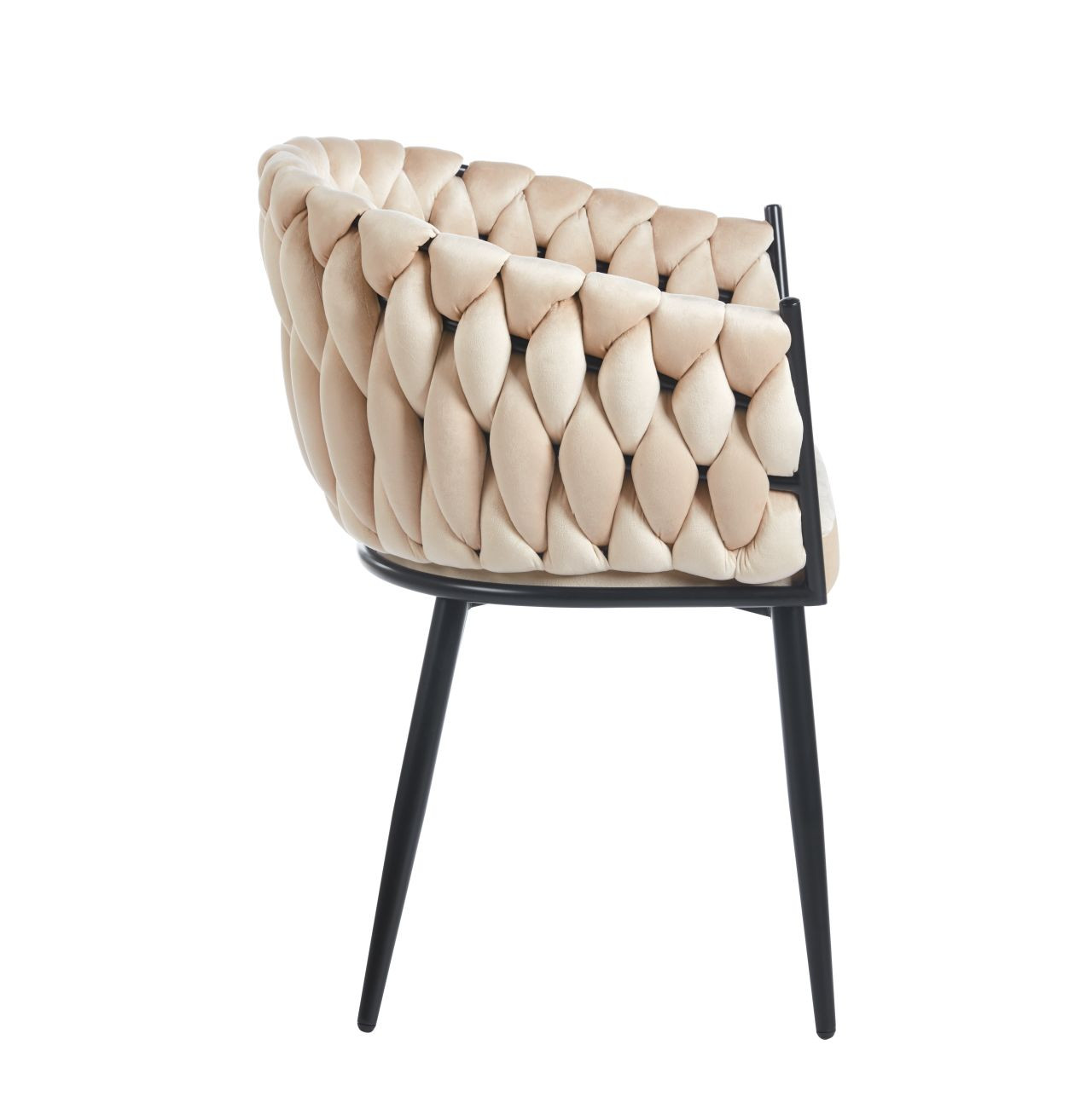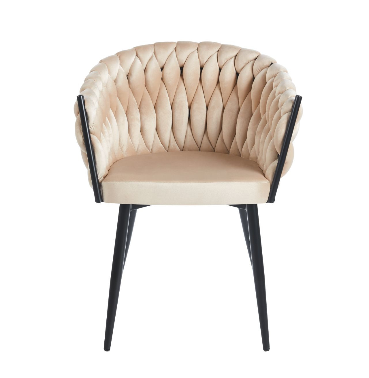 Le dossier de la chaise Maeva séduit par son capitonnage tridimensionnel en forme de tressage, évoquant les finitions des ateliers de haute couture. Cette structure texturée donne un aspect sophistiqué et unique, tout en mettant en valeur la teinte beige douce et apaisante. Les pieds en métal thermolaqué noir soulignent l’élégance du modèle et assurent un contraste moderne et équilibré.