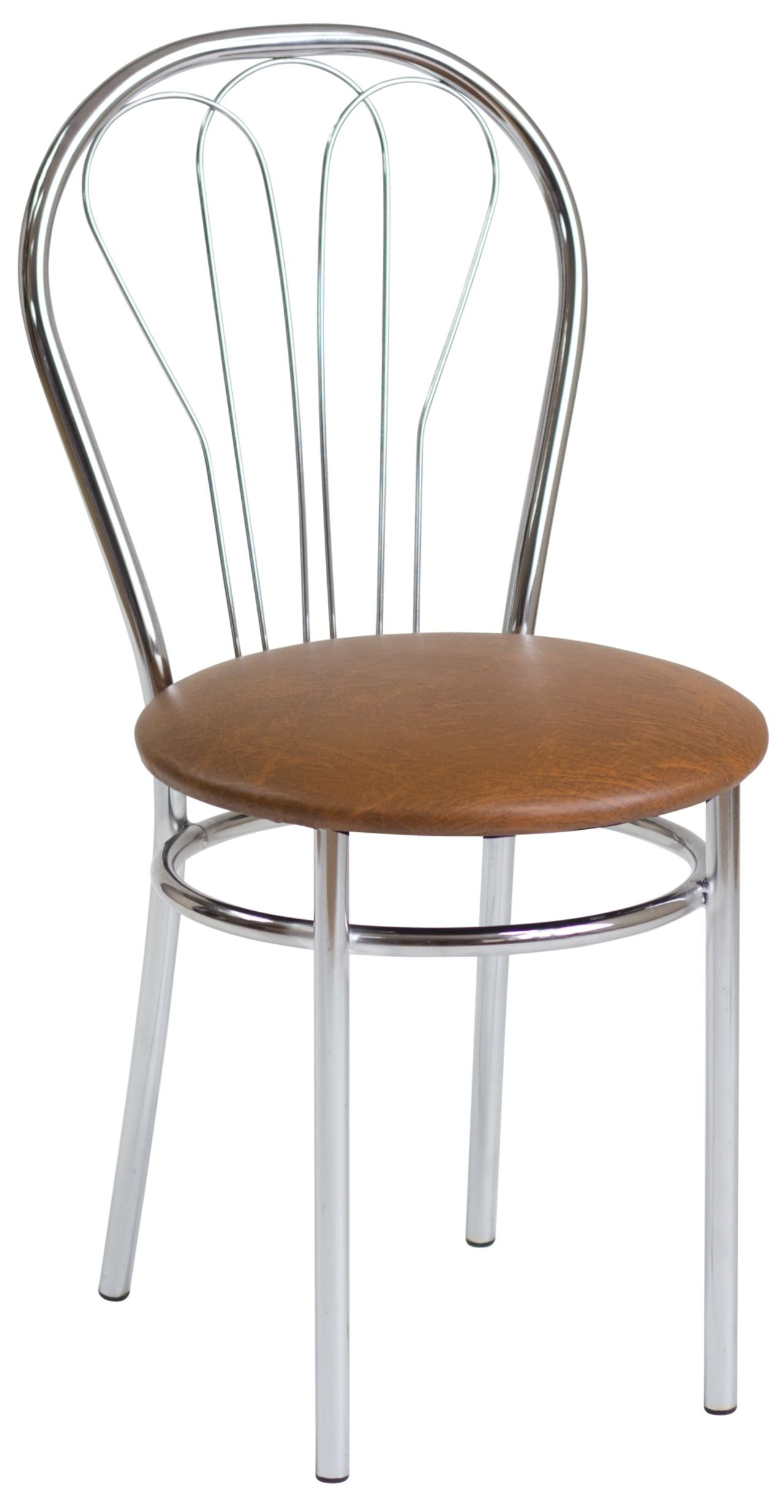 La chaise ROSA marron clair allie élégance rétro et confort moderne. Sa structure chromée brillante et son assise en similicuir offrent un rendu chaleureux et raffiné pour tout intérieur contemporain.