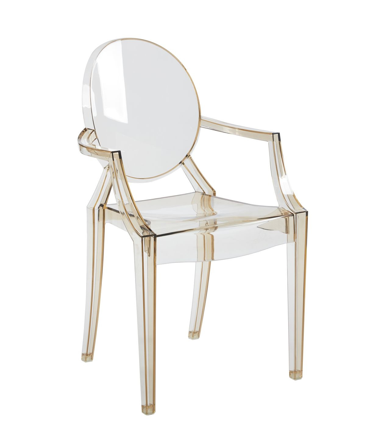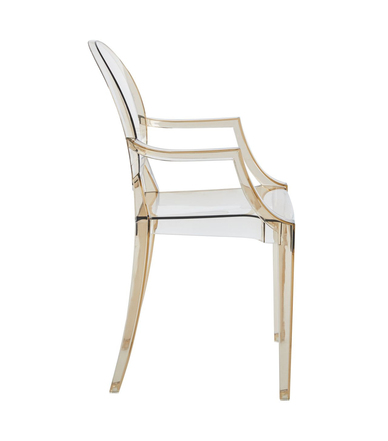 Chaise transparente avec accoudoirs en polycarbonate ambre. Élégance, confort et légèreté pour une déco intérieure moderne et lumineuse.