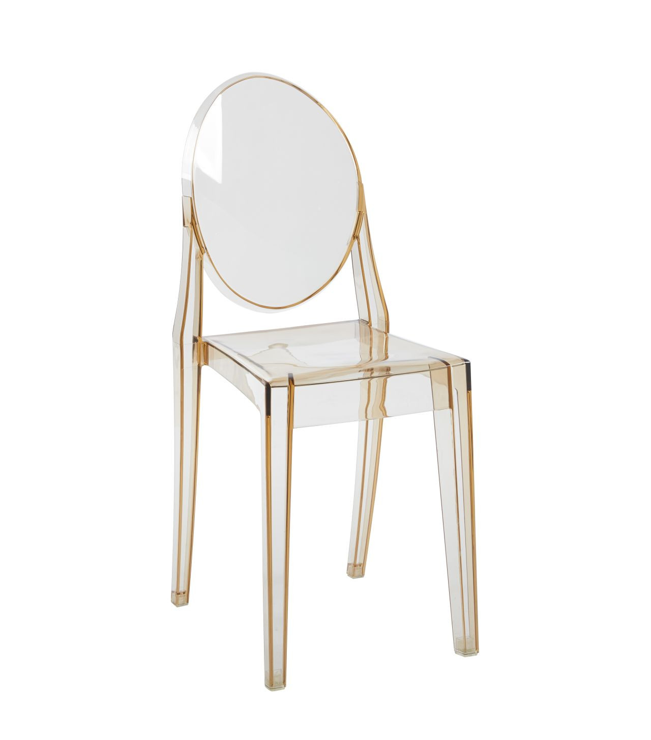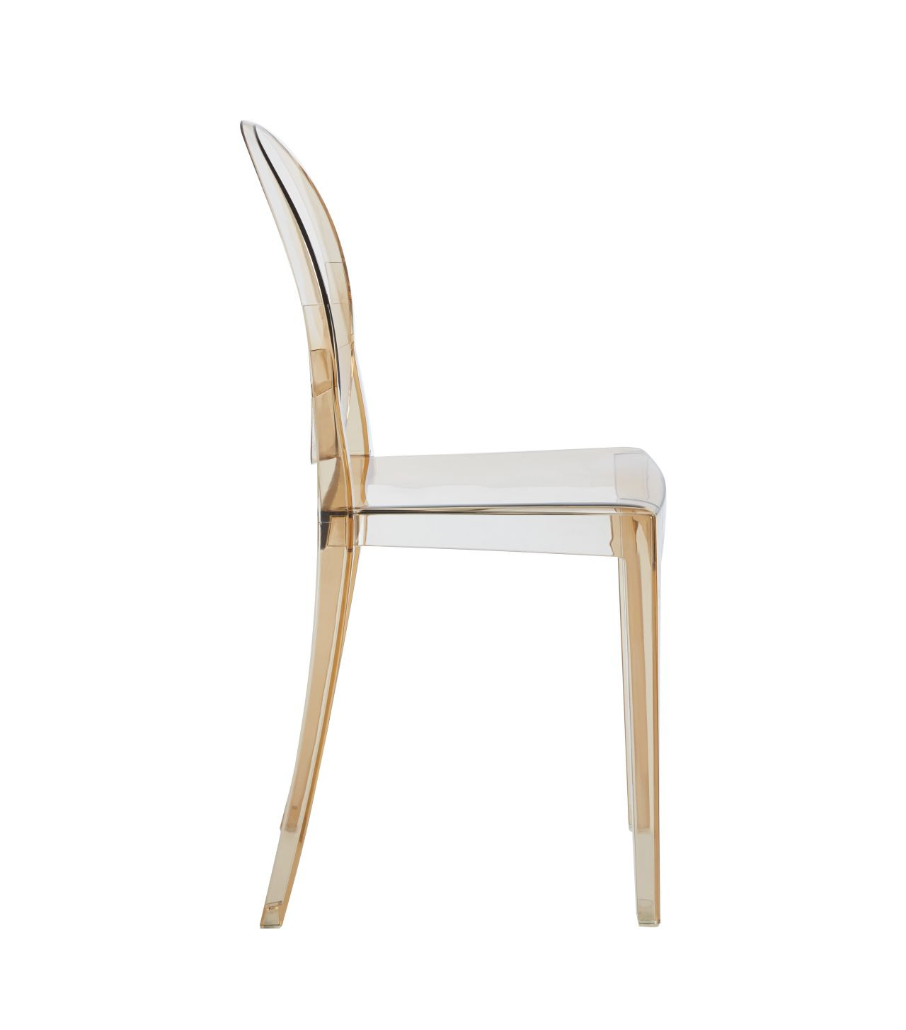 Chaise transparente Doria en polycarbonate ambre, au design chic et intemporel. Robuste, empilable et facile à intégrer dans tout type d’intérieur.
