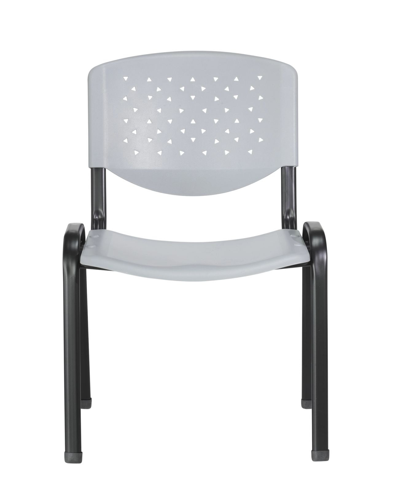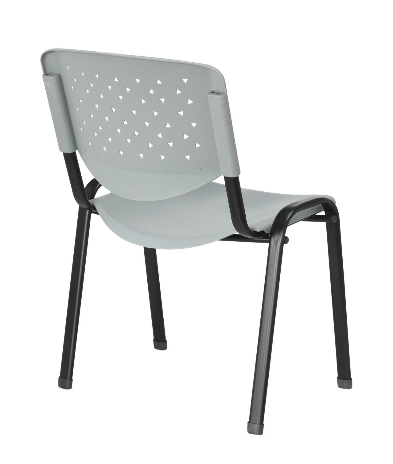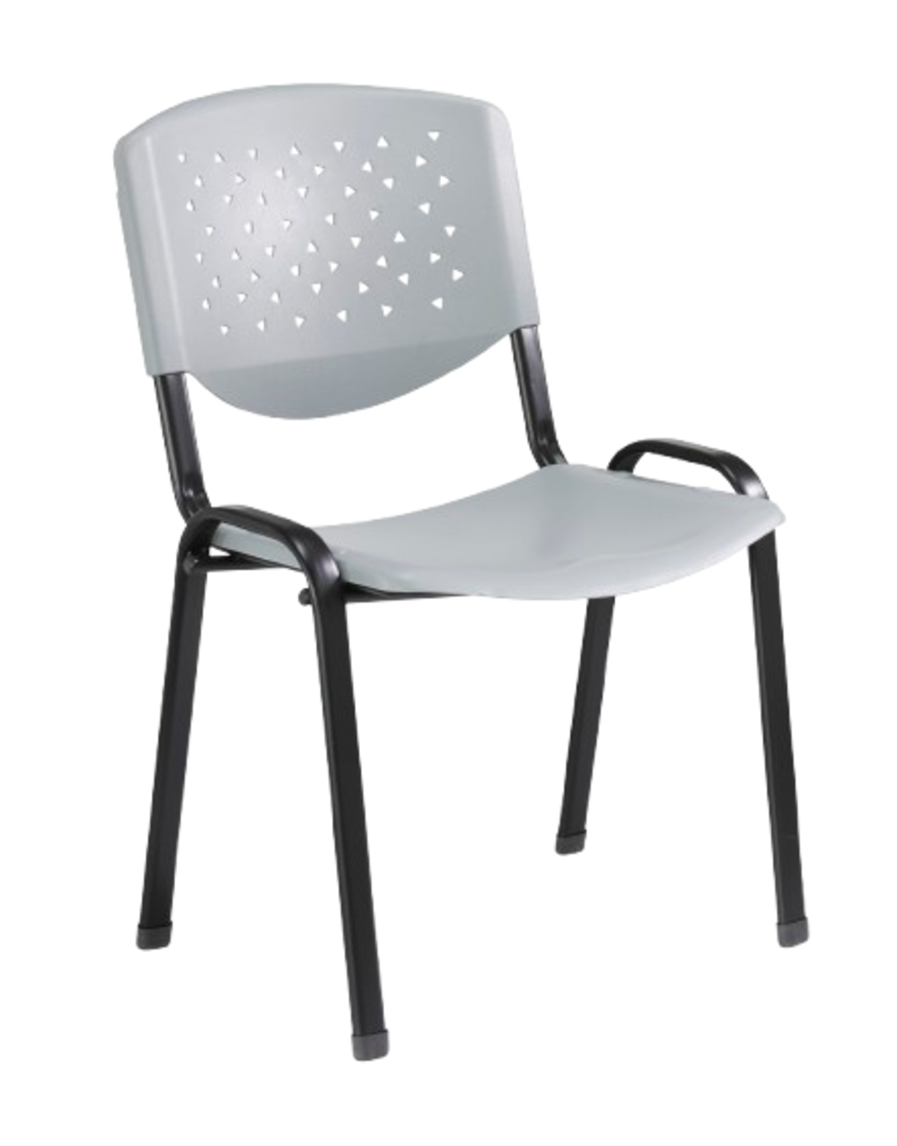 Chaise résistante gris clair avec dossier perforé, assise en plastique et cadre métallique noir. Idéale pour espaces collectifs ou usage quotidien.
