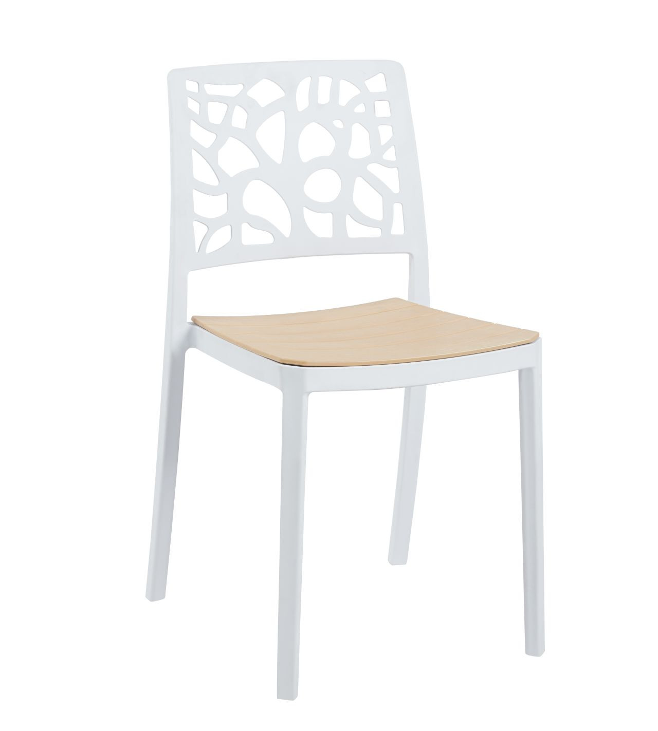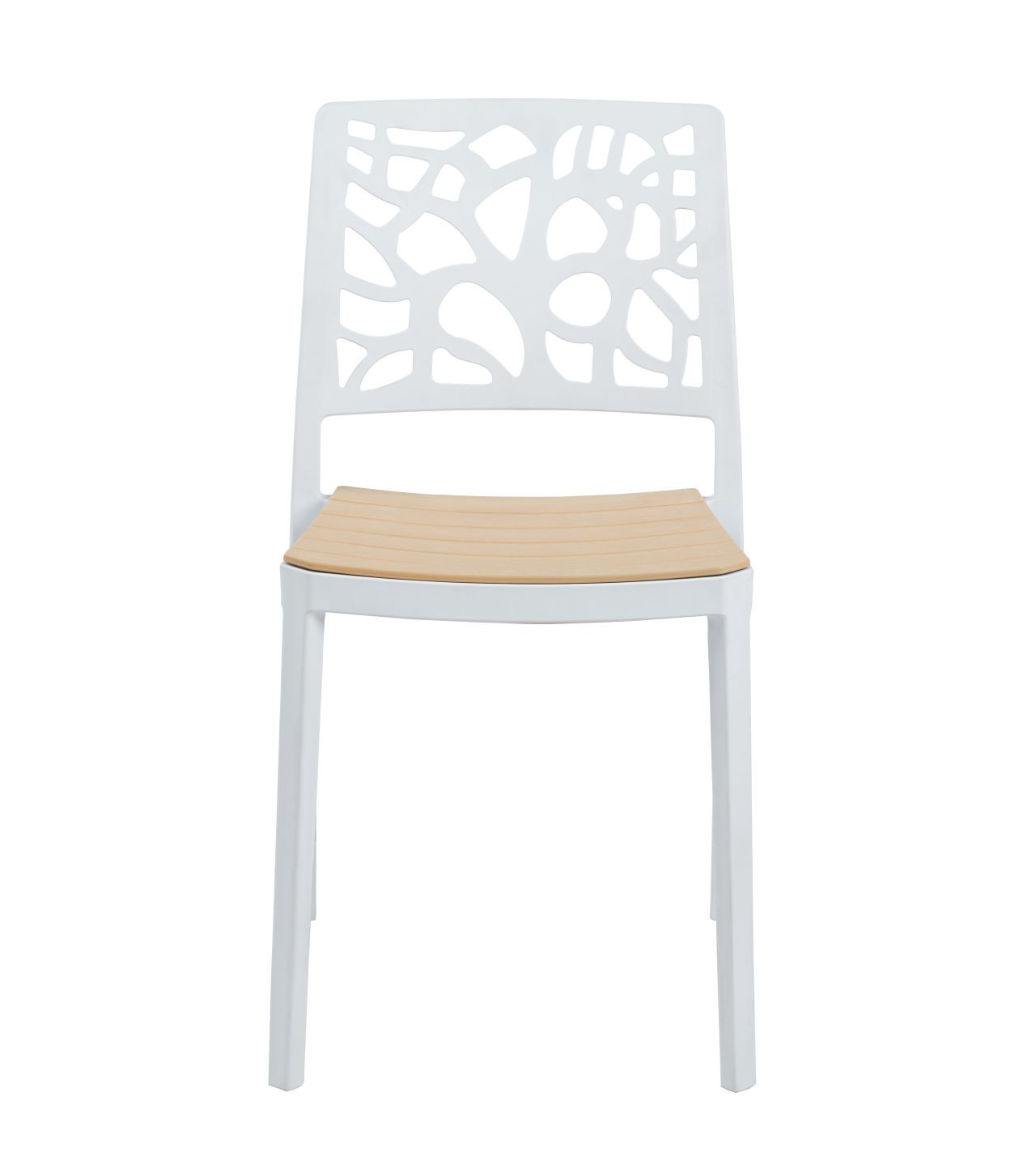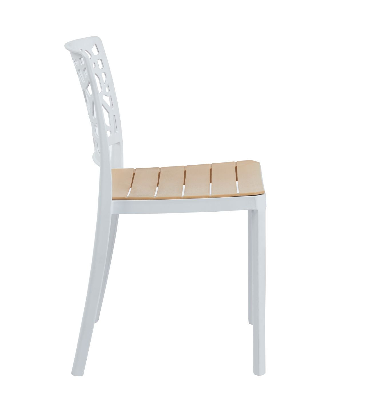 Chaise sans accoudoirs à dossier ajouré blanc et assise aspect bois clair. Empilable, anti-UV, robuste et design pour espaces extérieurs ou intérieurs.