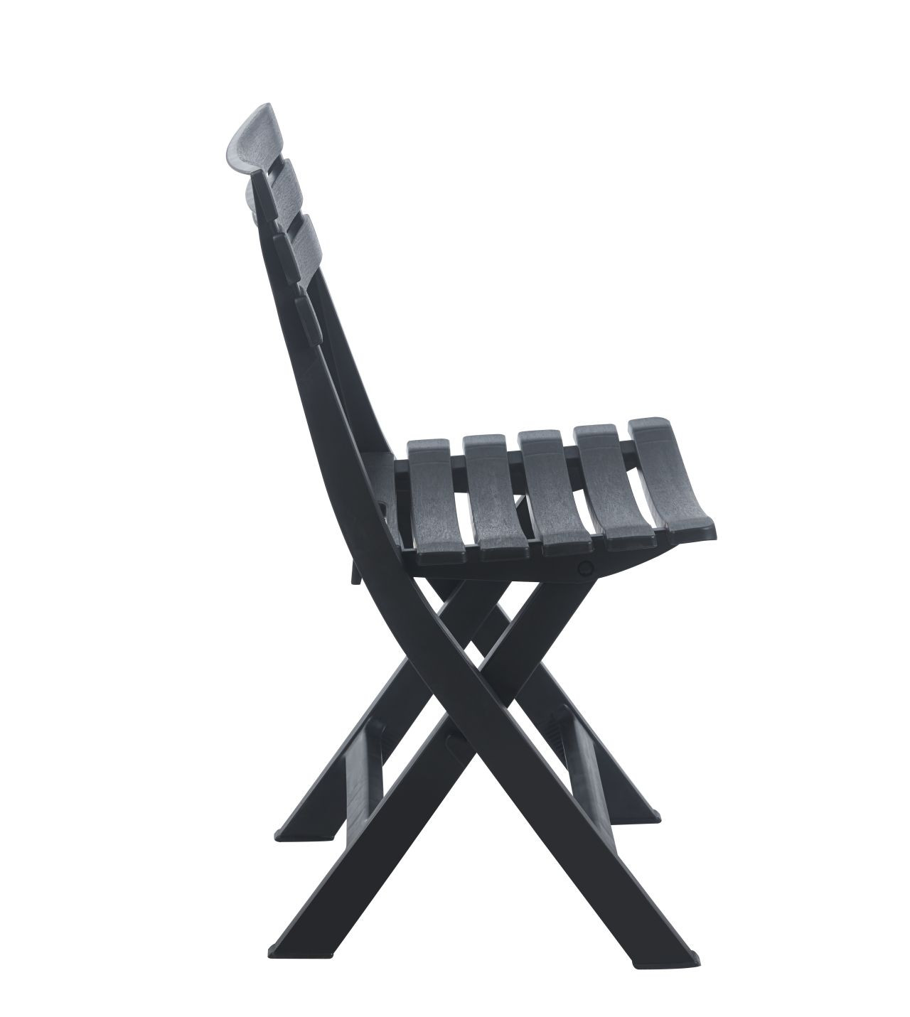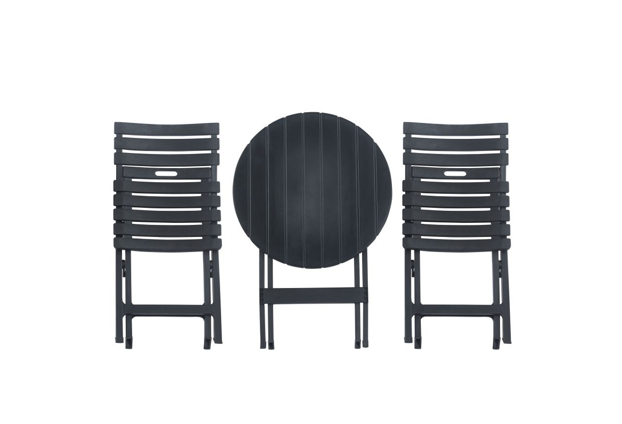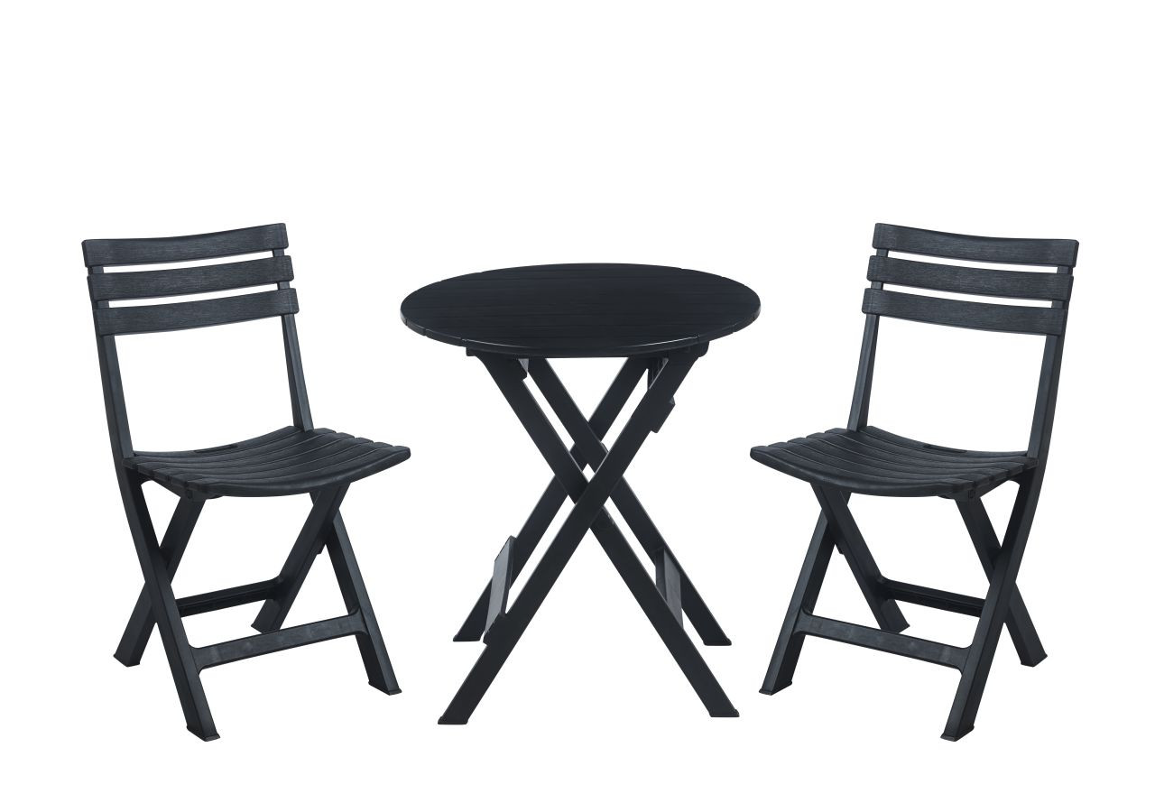 Set de jardin pliable IGOR noir : table ronde Ø60 cm et 2 chaises assorties, en plastique PP avec protection UV. Idéal pour balcon, terrasse ou jardin.
