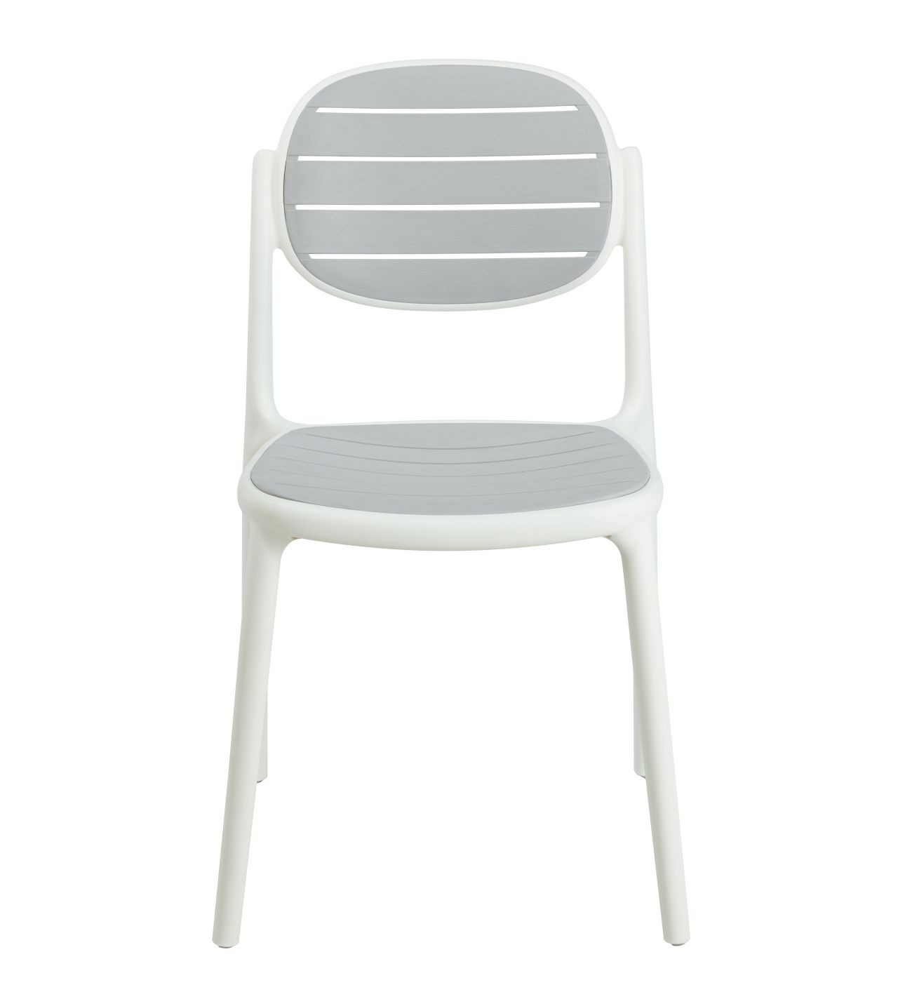 Chaise bicolore blanc & gris en plastique PP, design moderne, empilable et résistante aux UV. Idéale pour l’extérieur ou les intérieurs contemporains.