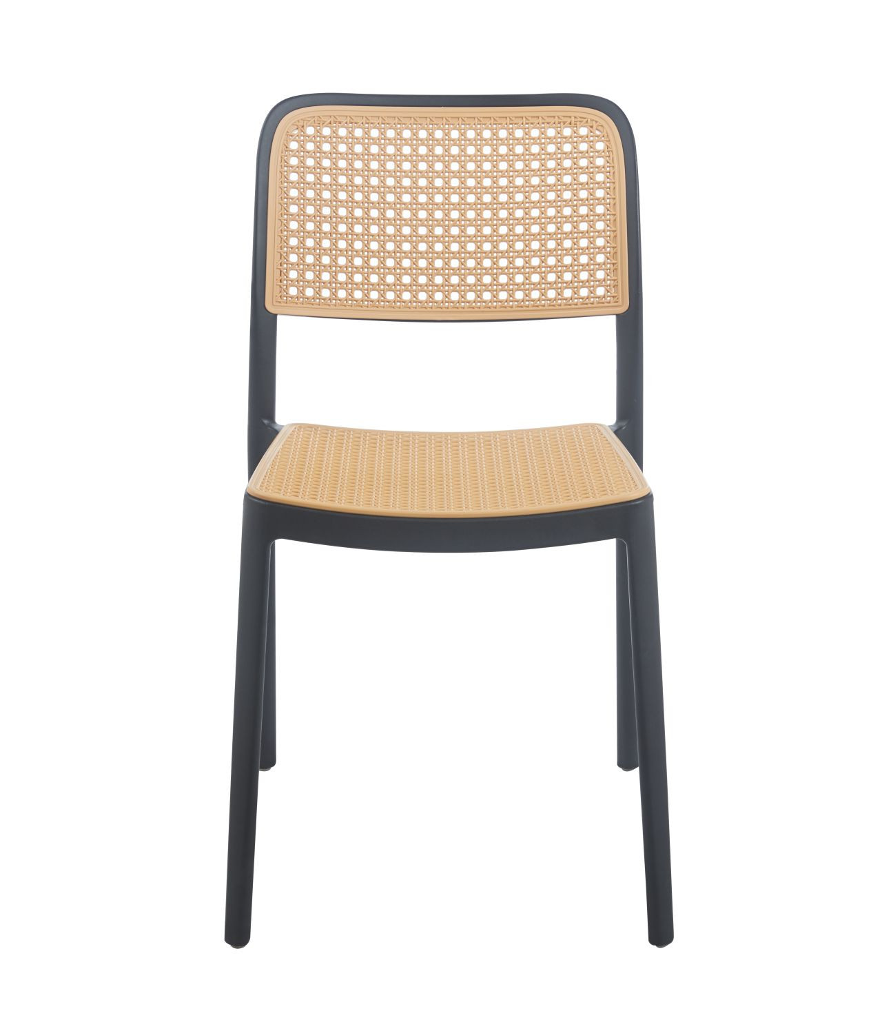 Chaise effet cannage naturel avec structure noire. Solide, empilable et traitée UV, elle s’adapte aussi bien à l’intérieur qu’à l’extérieur.