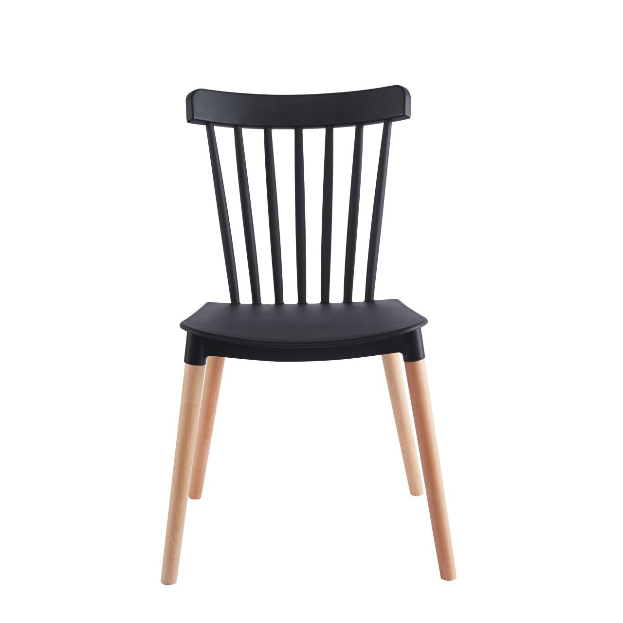 La chaise Aria noire combine élégance et robustesse avec son dossier à barreaux en plastique et ses pieds en bois de hêtre naturel.