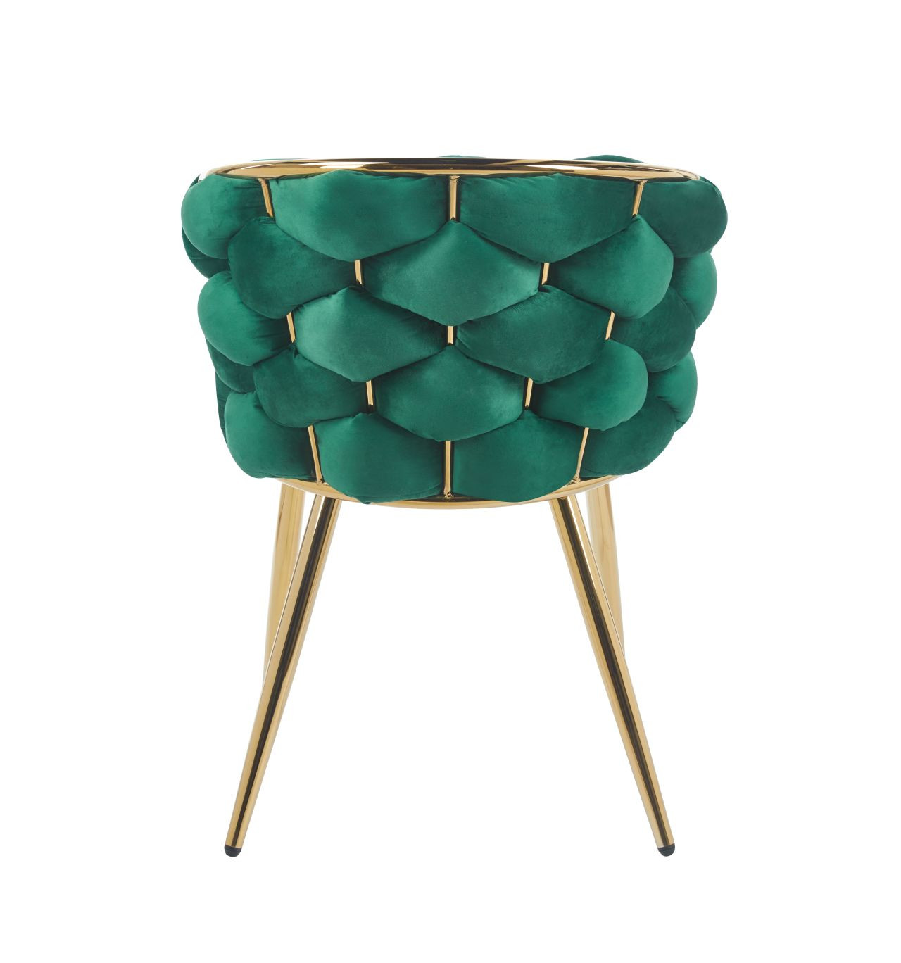 Chaise Azzura en velours vert émeraude avec structure dorée brillante. Dossier design alvéolé. Élégance et confort haut de gamme.