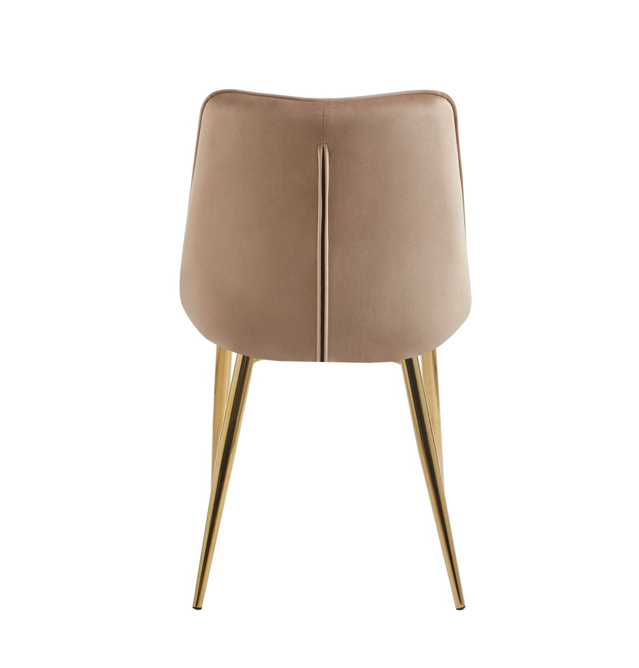 La chaise Victor velours cappuccino séduit par sa silhouette élégante et ses pieds dorés chromés. Son dossier matelassé et son assise moelleuse en font une chaise raffinée et confortable, parfaite pour sublimer une salle à manger moderne.