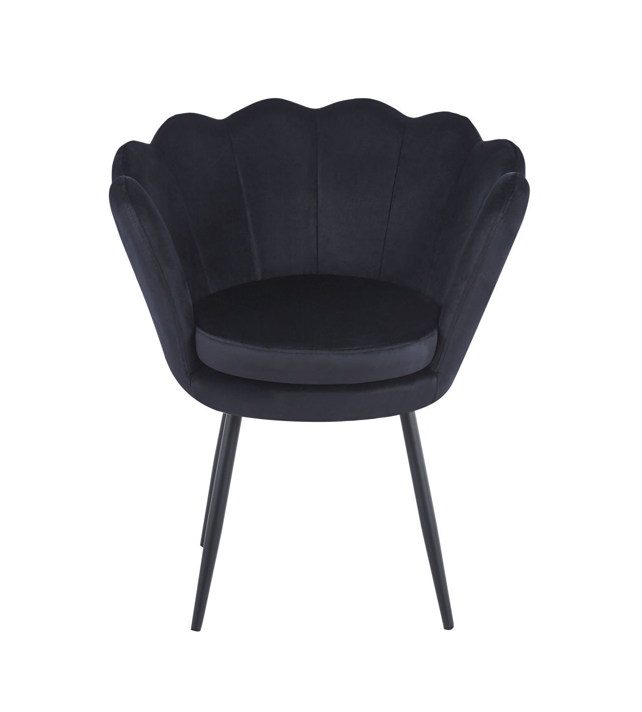 La Chaise Coquillage Golddeco en velours noir et pieds noirs s’impose comme une pièce chic et intemporelle.