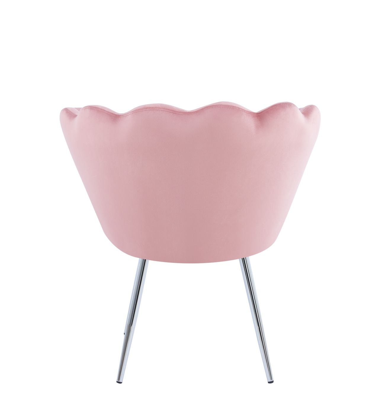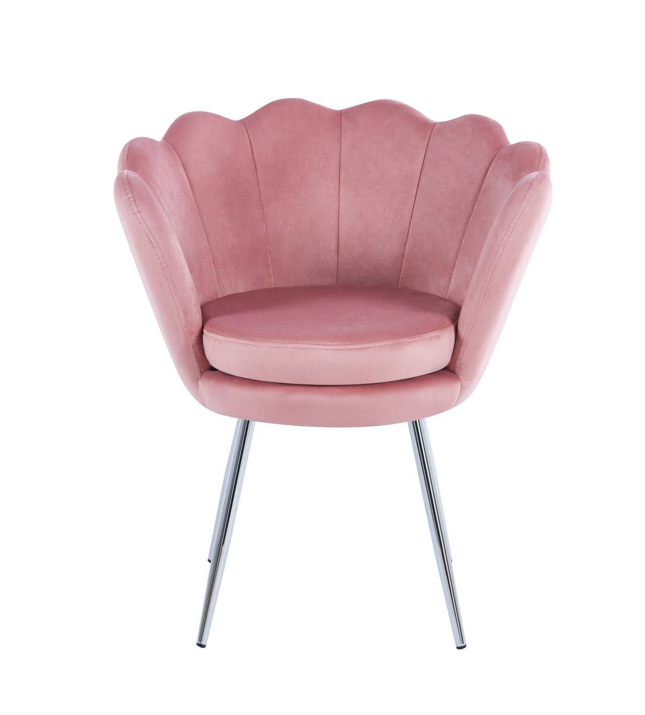 La Chaise Coquillage Golddeco en velours rose et pieds chromés allie élégance féminine et confort contemporain.