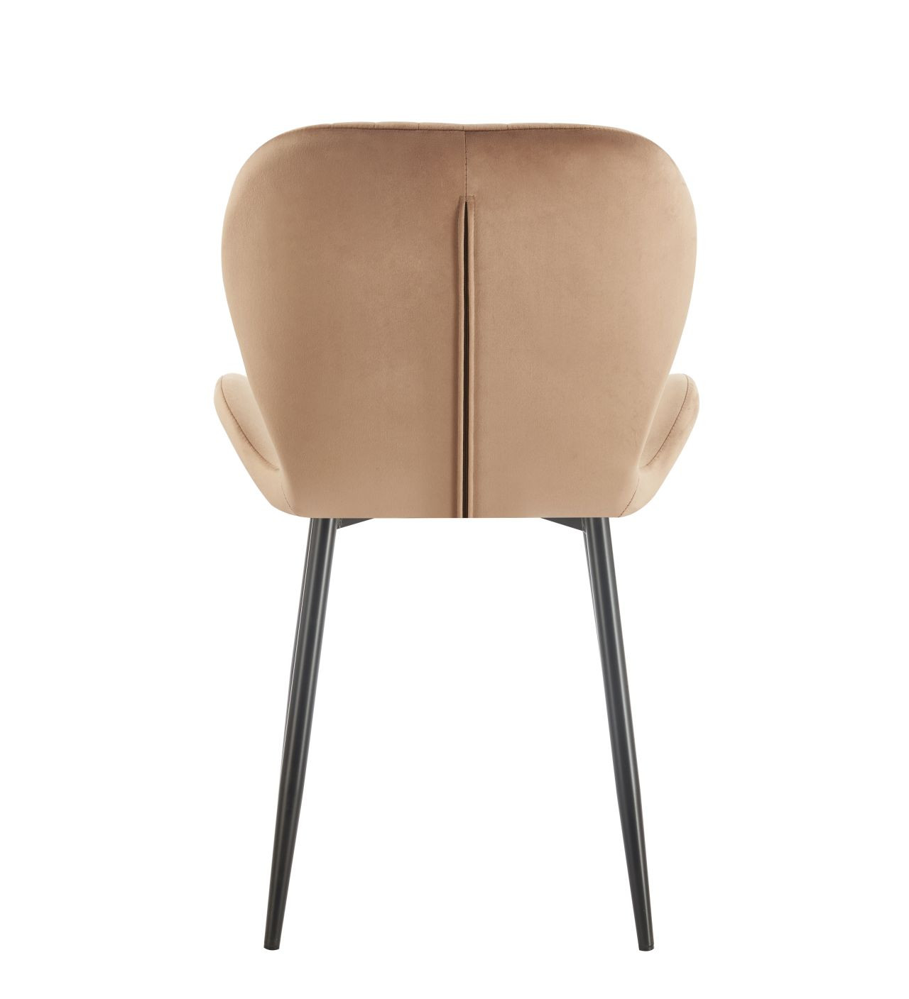 Les surpiqûres verticales du dossier ajoutent une touche chic et structurée. Les pieds fuselés en métal thermolaqué noir offrent une stabilité irréprochable et un contraste élégant avec la teinte douce du velours.
