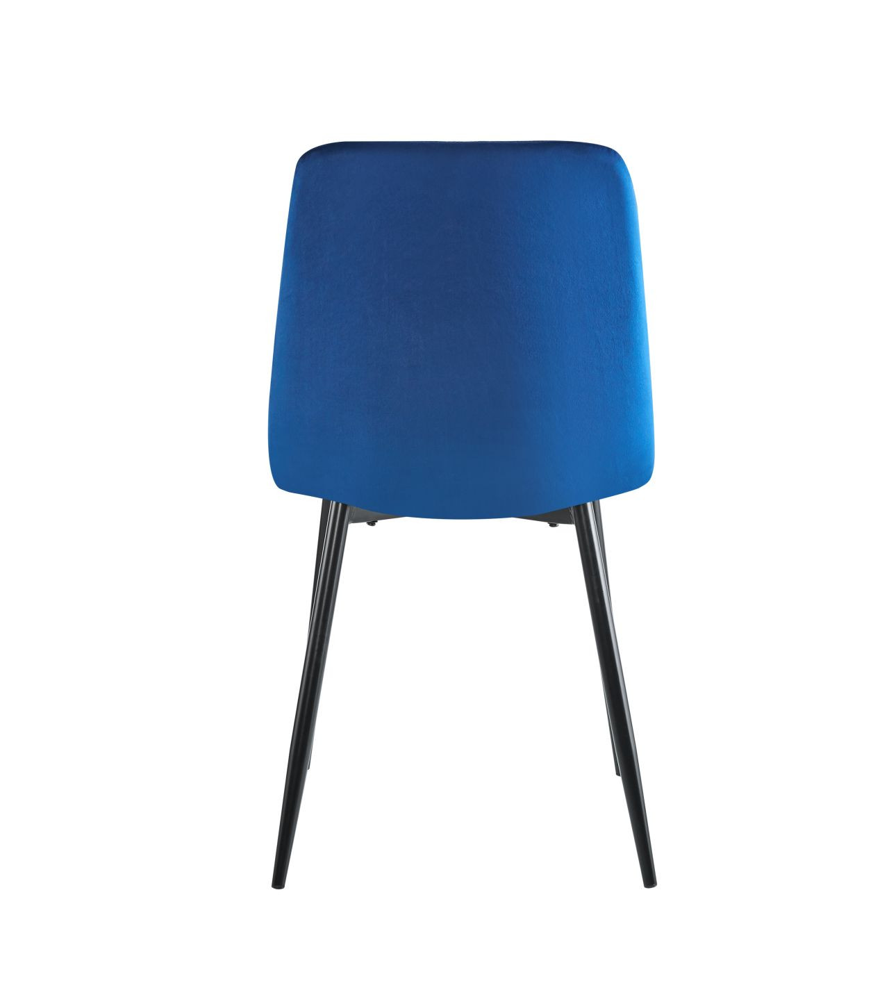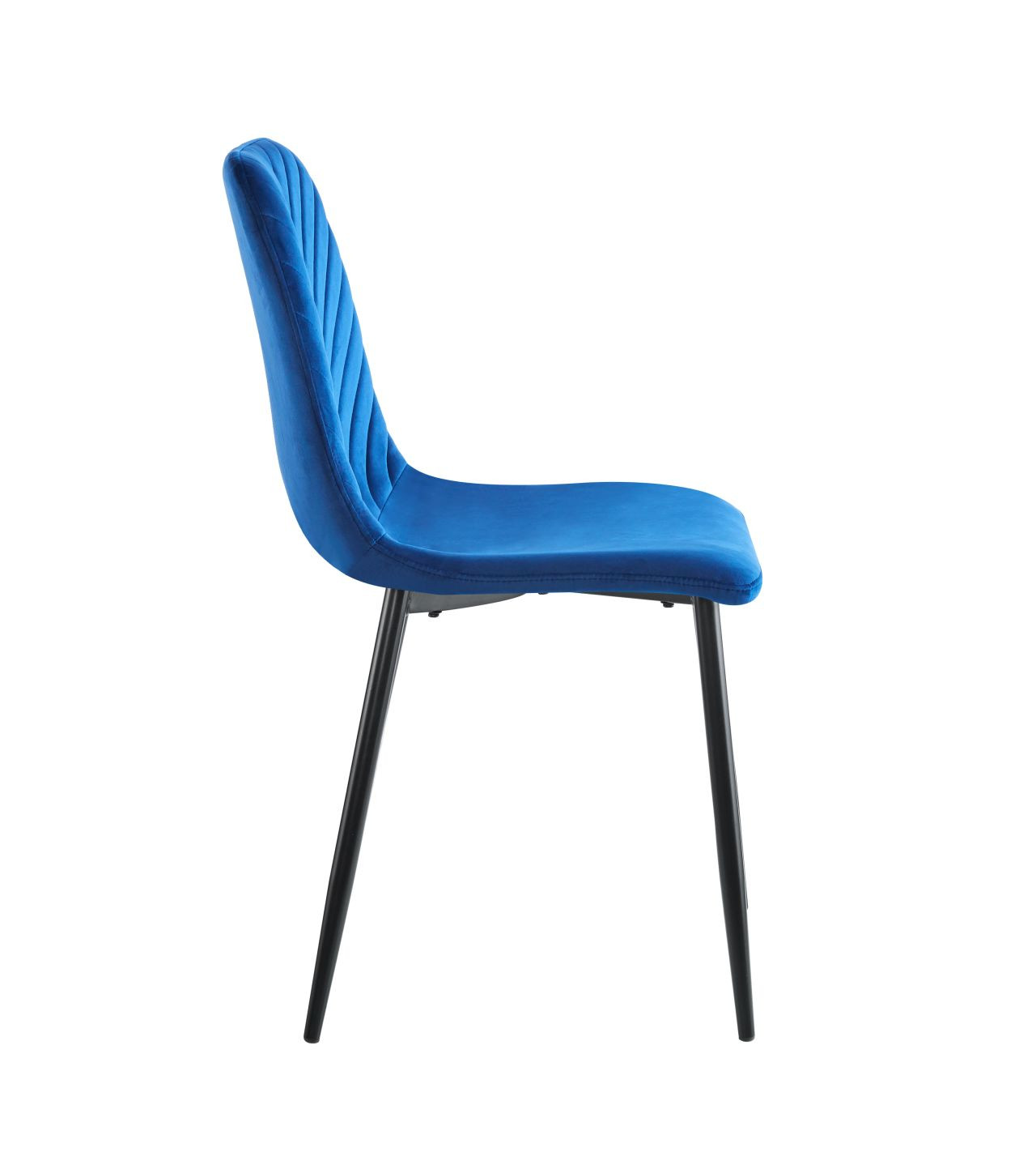 La chaise Sevilla en velours bleu royal séduit par sa teinte intense et son allure élégante. Son dossier matelassé en chevrons et ses pieds élancés en métal noir forment un ensemble équilibré, idéal pour une salle à manger raffinée ou un bureau stylé.