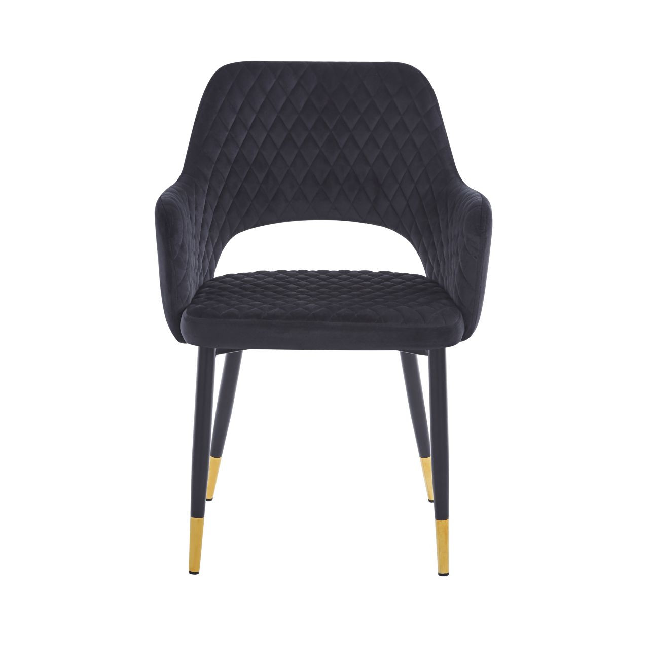 La chaise Madrid en velours noir conjugue élégance contemporaine et caractère affirmé. Son assise matelassée, son dossier incurvé et ses pieds noirs ornés d’embouts dorés incarnent le raffinement absolu selon Golddeco.