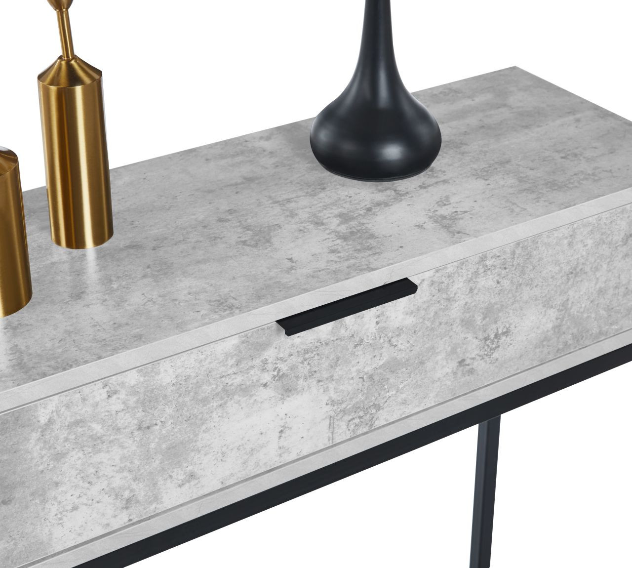 La console NORA aspect béton revisite le design industriel avec modernité. Son plateau effet béton clair apporte une texture brute et naturelle, tandis que son piètement en métal noir thermolaqué souligne une élégance urbaine. Idéale dans une entrée, un séjour ou un bureau, cette console combine esthétique et fonctionnalité.