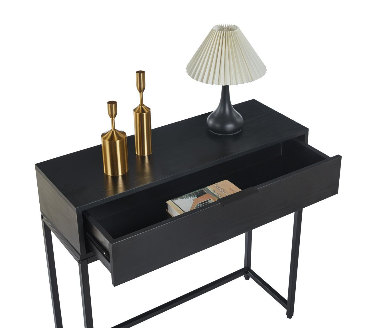 La console NORA noire séduit par son design contemporain et sa finition noire profonde. Son tiroir discret et sa structure fine en métal en font un meuble à la fois esthétique et fonctionnel, idéal pour une entrée, un couloir ou un salon moderne.