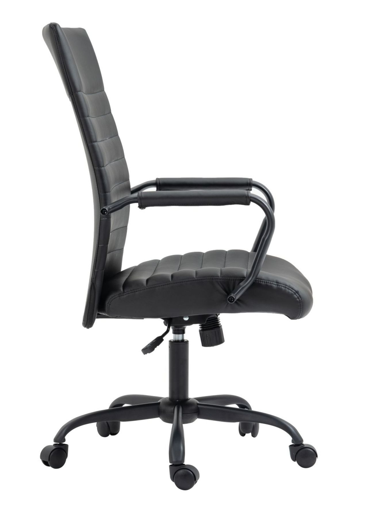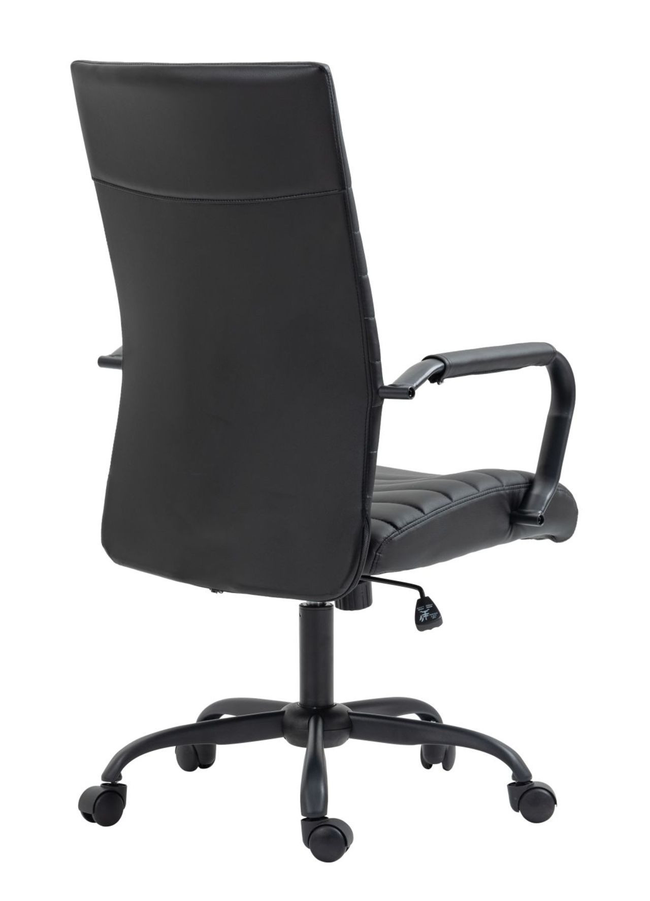 Entièrement revêtu de similicuir noir, ce fauteuil allie finesse visuelle et robustesse. Le piètement noir à cinq branches offre une base solide, tandis que les roulettes pivotantes garantissent une mobilité fluide sur toutes surfaces.