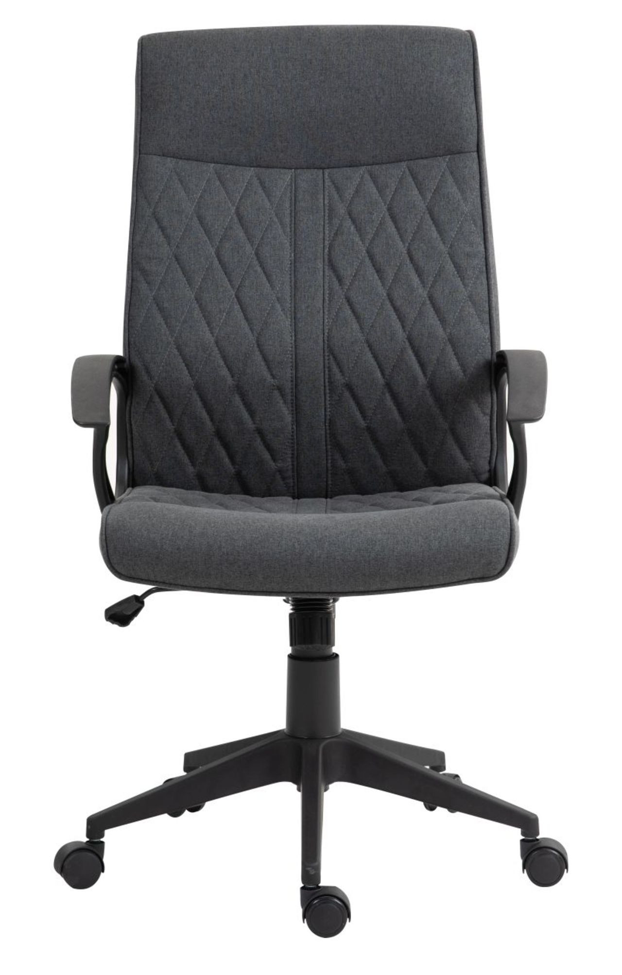 Le fauteuil de bureau DEXTER en tissu gris foncé séduit par son allure élégante et sa conception ergonomique. Parfait pour le bureau ou le télétravail, il allie praticité et esthétique grâce à sa silhouette épurée et ses finitions matelassées en losange.