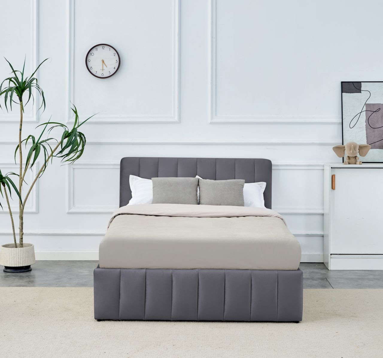 Associez ce lit coffre en velours gris à des accessoires argentés ou des textiles en lin clair pour un rendu équilibré et moderne. Idéal pour les chambres aux tons neutres et apaisants.