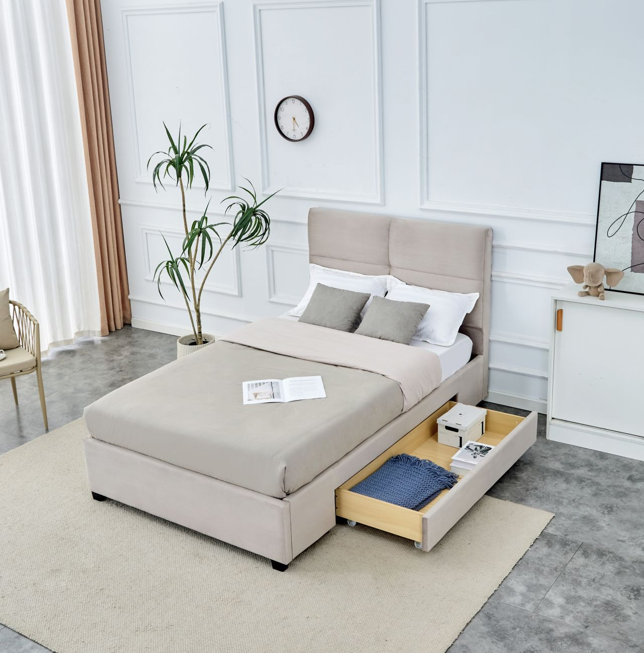 Sa tête de lit moelleuse et son tiroir de rangement intégré en font un meuble à la fois élégant et pratique.