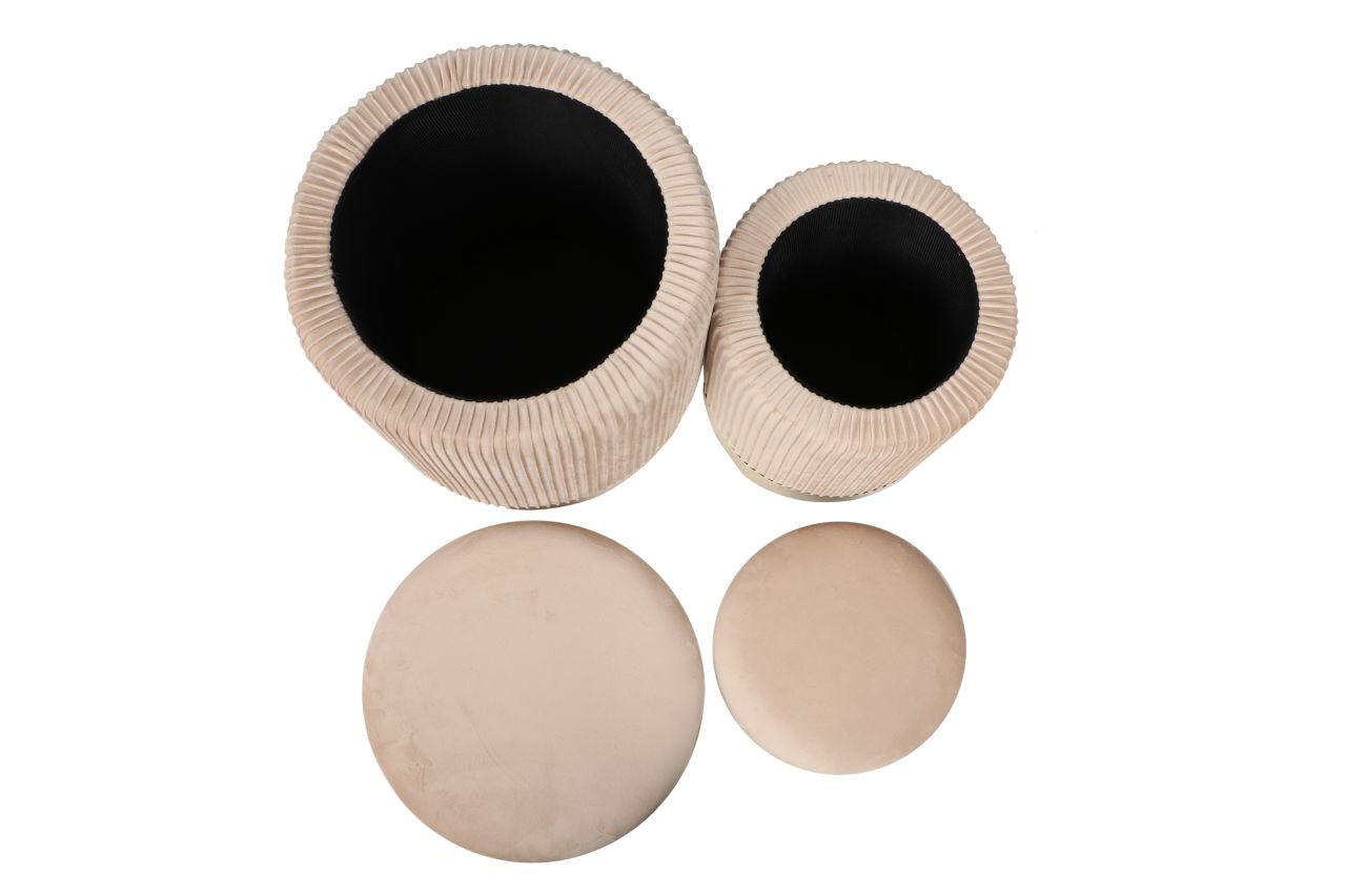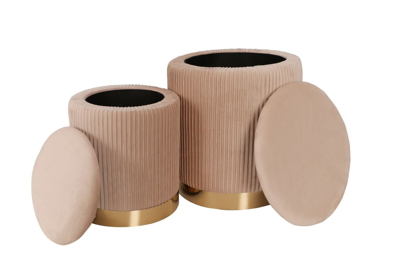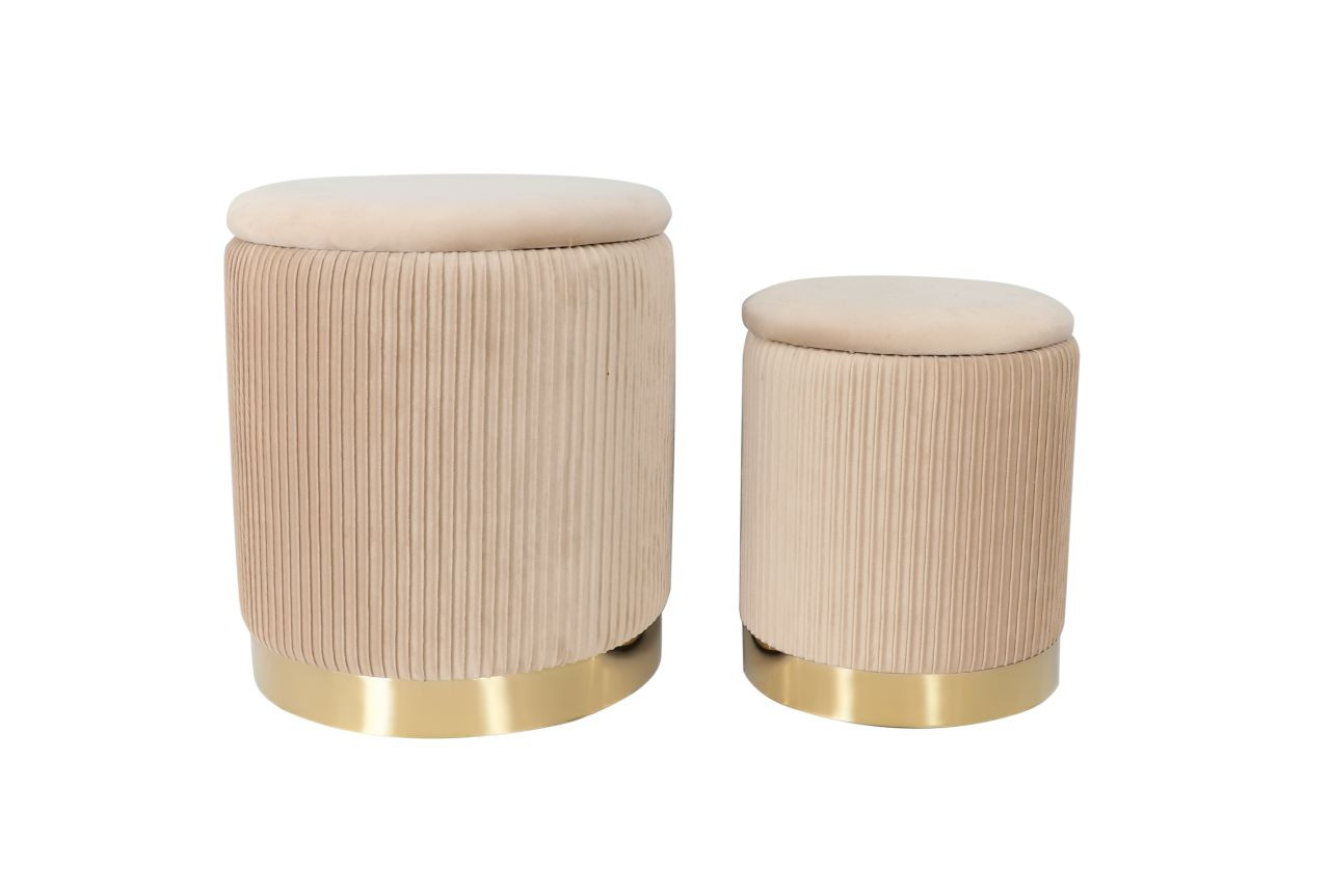 Lot de 2 poufs gigognes Calipso en velours beige et base dorée. Élégants, pratiques et design, ils s’emboîtent facilement et offrent un rangement discret et raffiné.