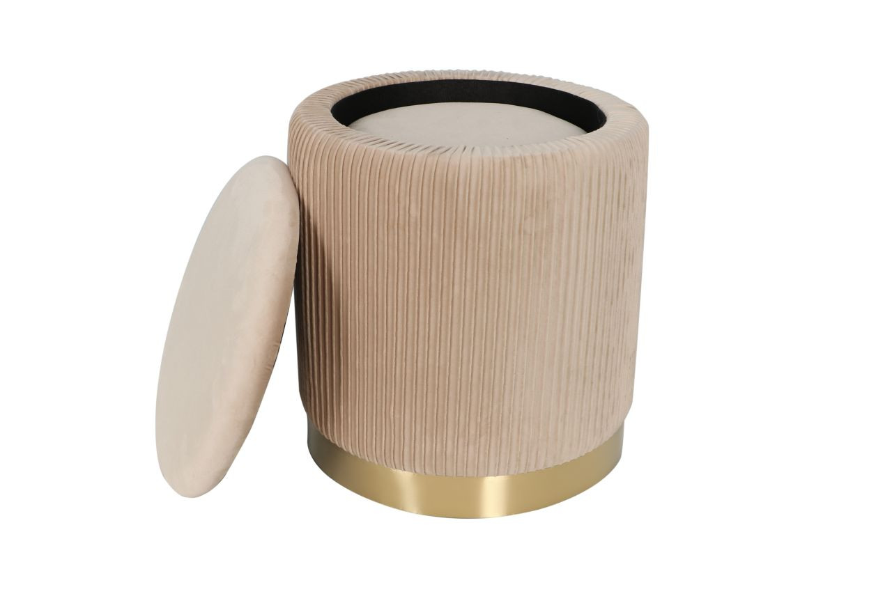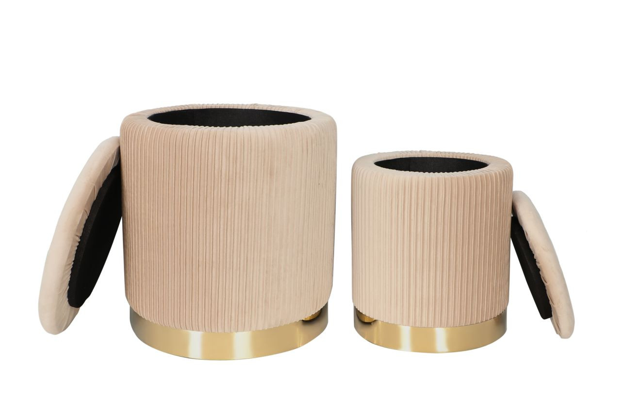 Les poufs Calipso beige s’adaptent à tous les styles d’intérieur. Ils servent à la fois d’assise d’appoint, de coffre discret et d’élément décoratif. Un duo design et fonctionnel qui allie confort, rangement et élégance dorée.