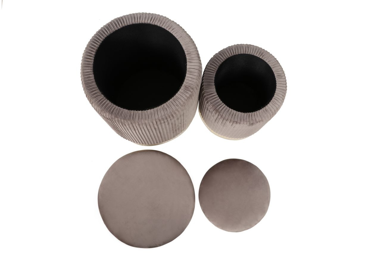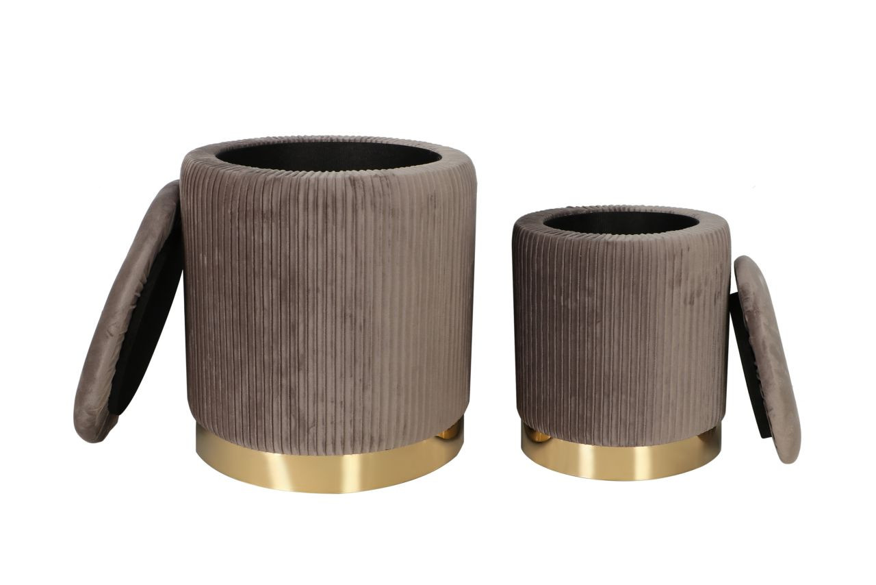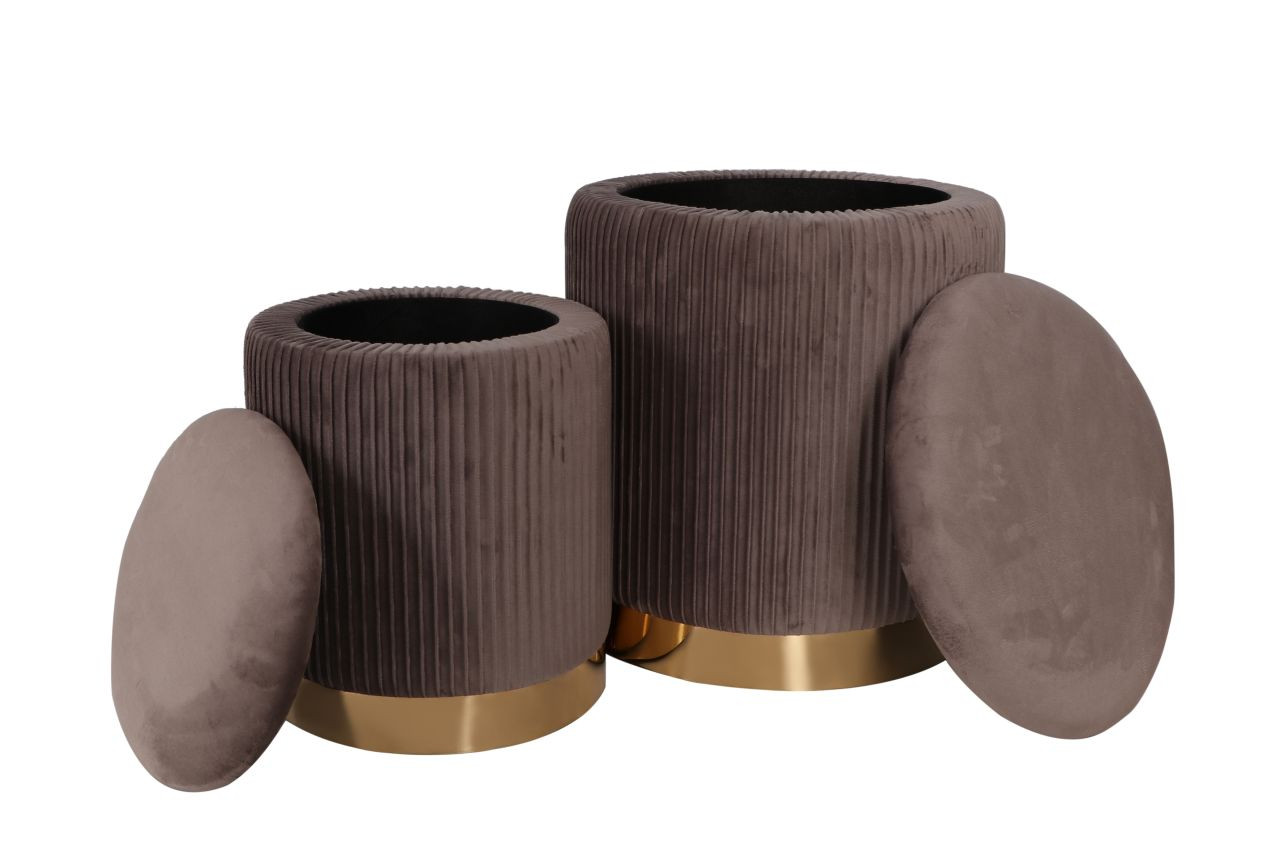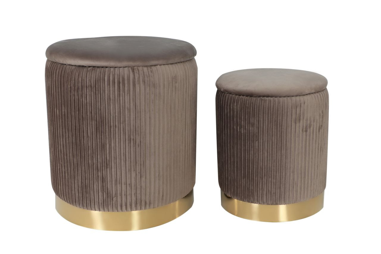 Lot de 2 poufs gigognes Calipso en velours gris taupe avec base dorée. Élégants, fonctionnels et gain de place, ils ajoutent une touche chic à tout intérieur.