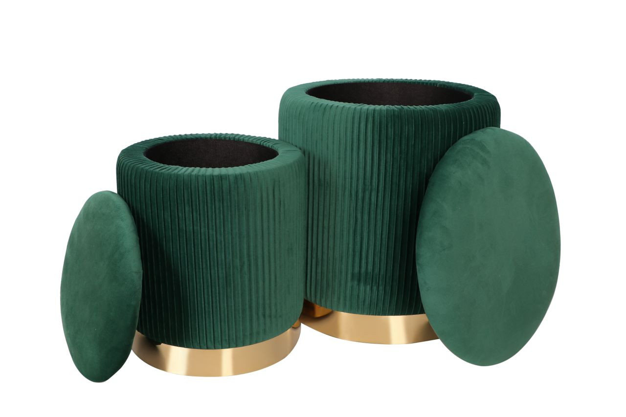 Lot de 2 poufs gigognes Calipso en velours vert avec base dorée. Élégants et fonctionnels, ils s’emboîtent pour un rangement malin et une touche déco chic.