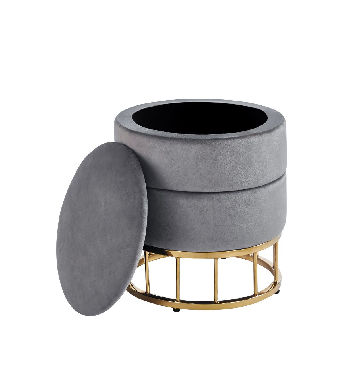 Pouf de rangement Akord en velours gris avec structure dorée. Élégant et fonctionnel, il allie design contemporain et praticité grâce à son espace de rangement intégré.
