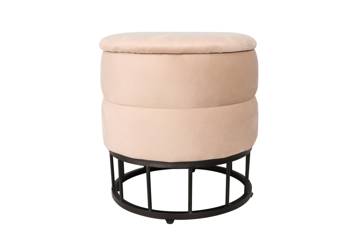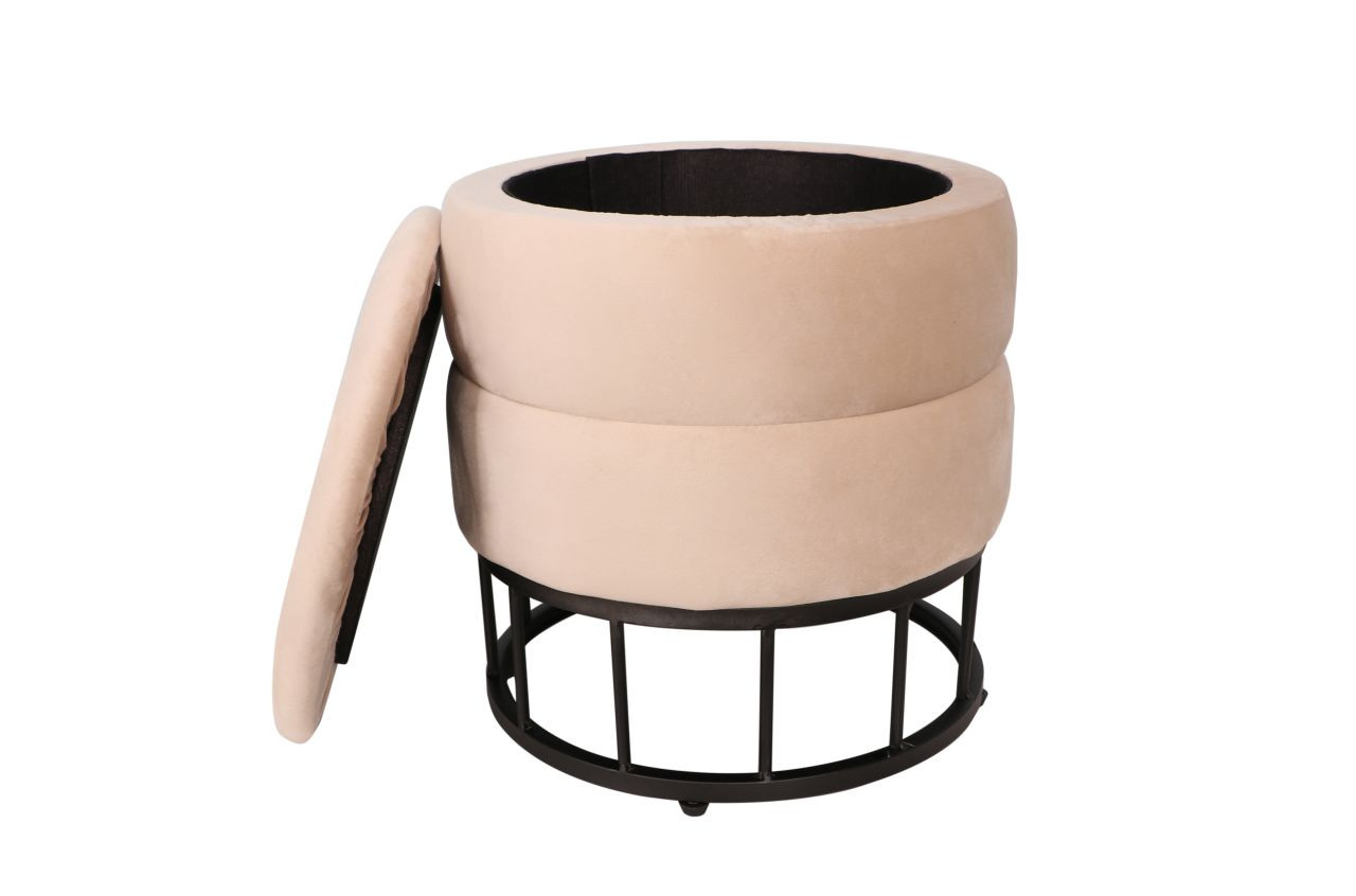 Pouf de rangement Akord en velours beige avec structure noire. Élégant et pratique, il associe confort et fonctionnalité pour sublimer tout type d’intérieur contemporain.