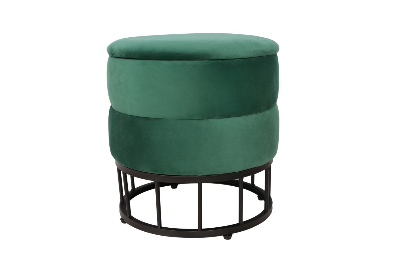 Pouf de rangement Akord en velours vert avec base métallique noire. Élégant, pratique et confortable, il offre un espace discret pour ranger vos accessoires du quotidien.