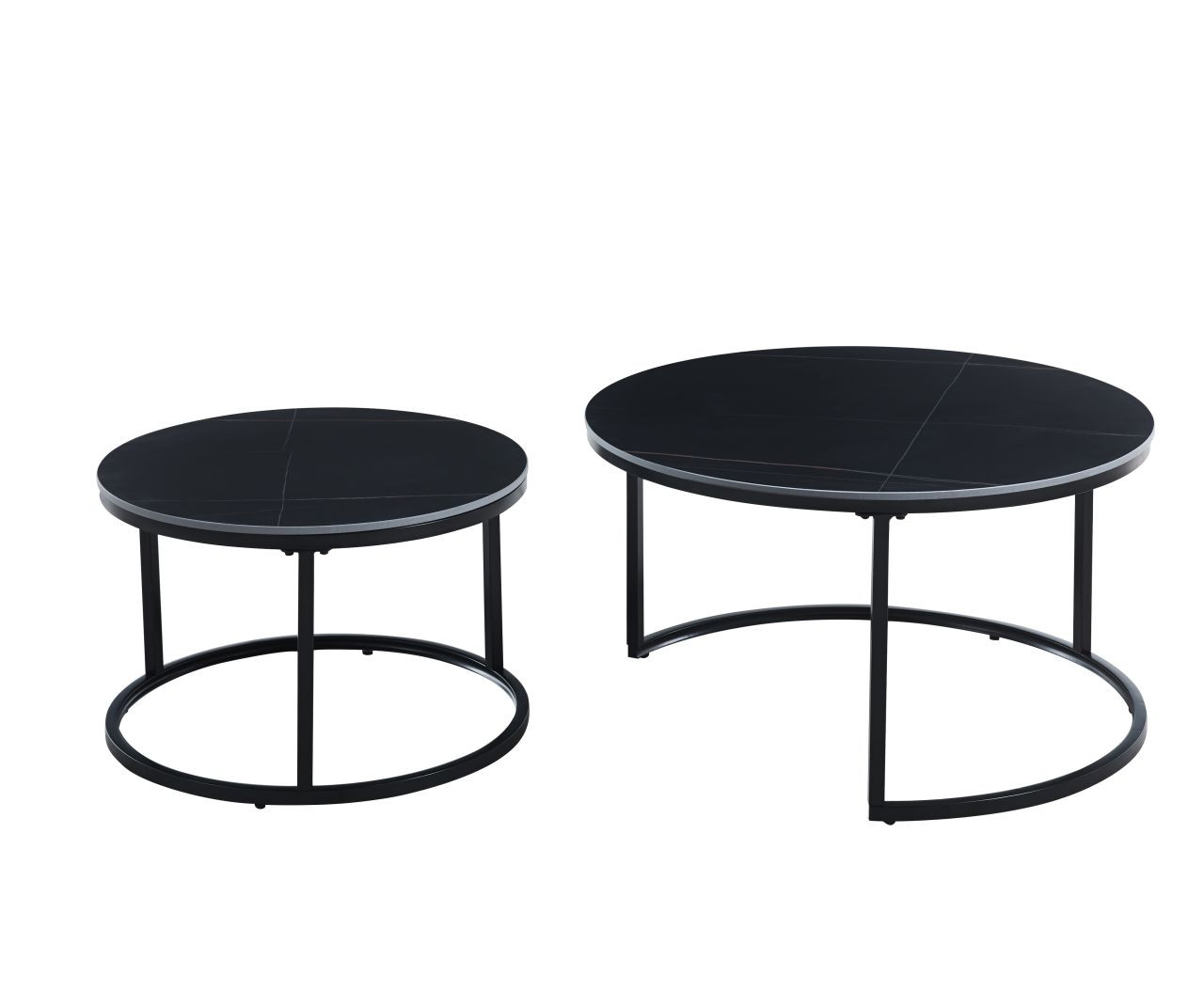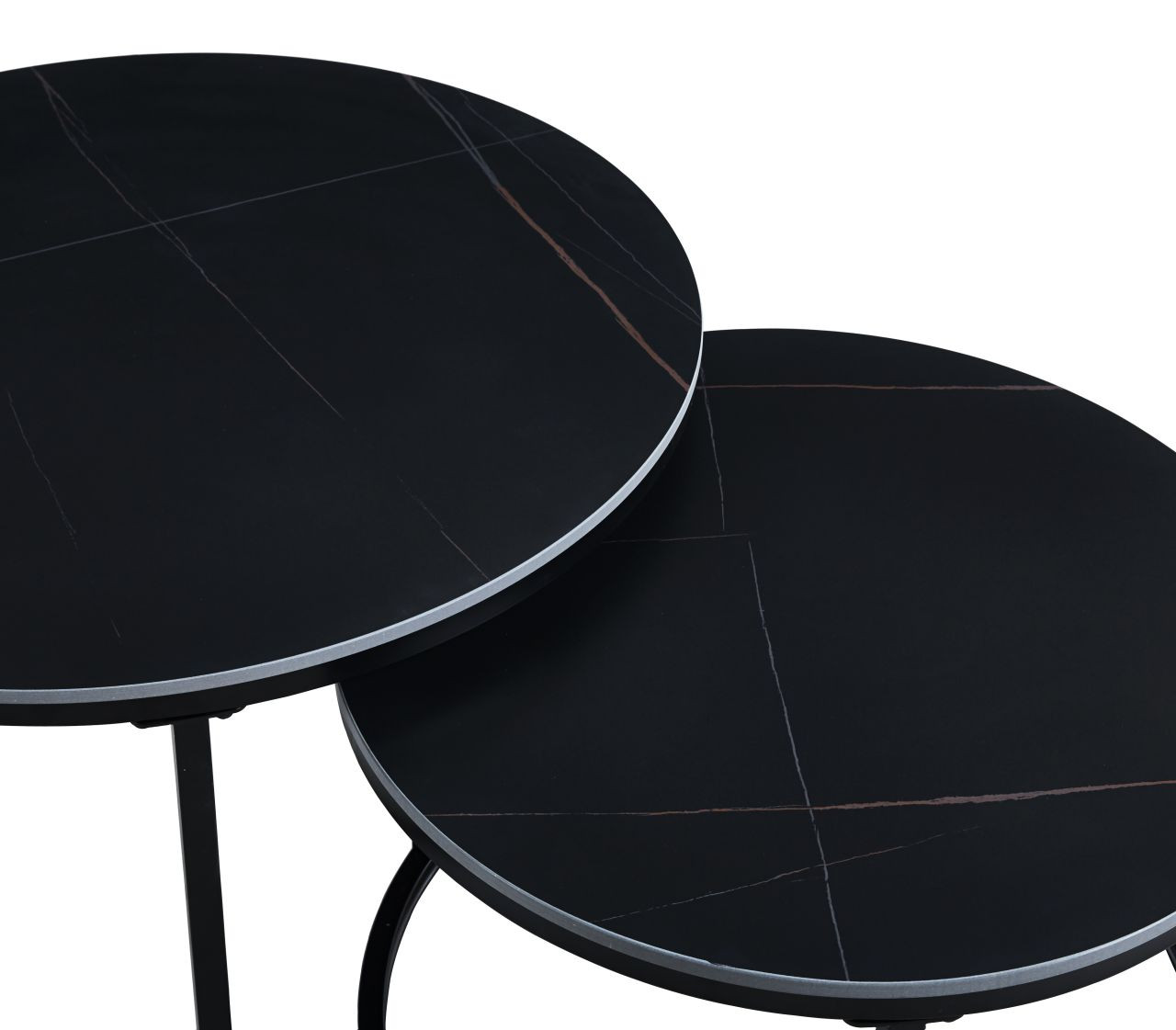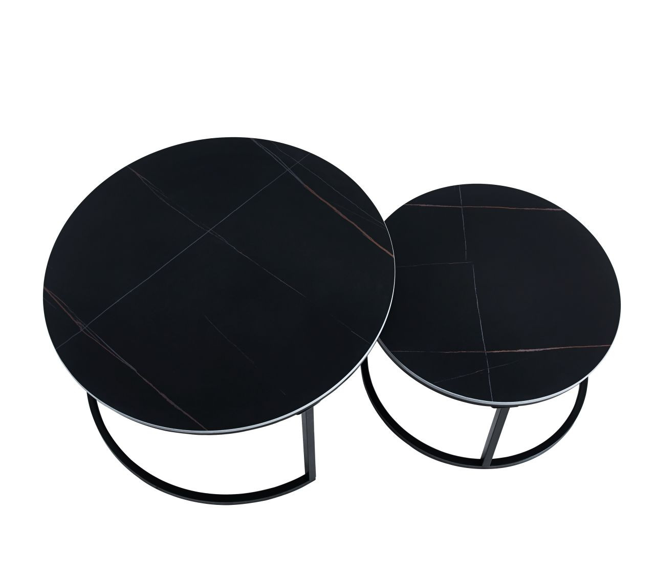 Ensemble de deux tables basses rondes avec plateaux en céramique noire mate et pieds en métal thermolaqué noir. Design chic, empilables et fonctionnelles.