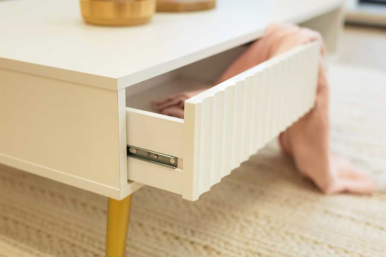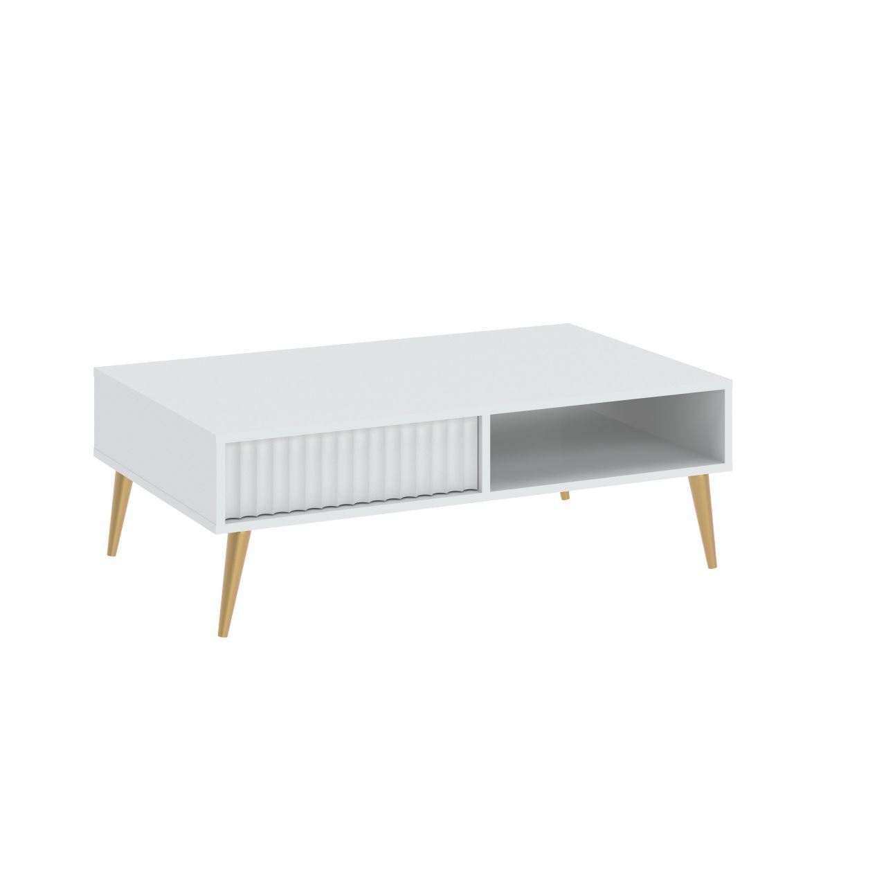 Table basse au design scandinave épuré avec tiroir rainuré, finition blanche brillante et pieds coniques en bois or mat. Fonction push-open intégrée.