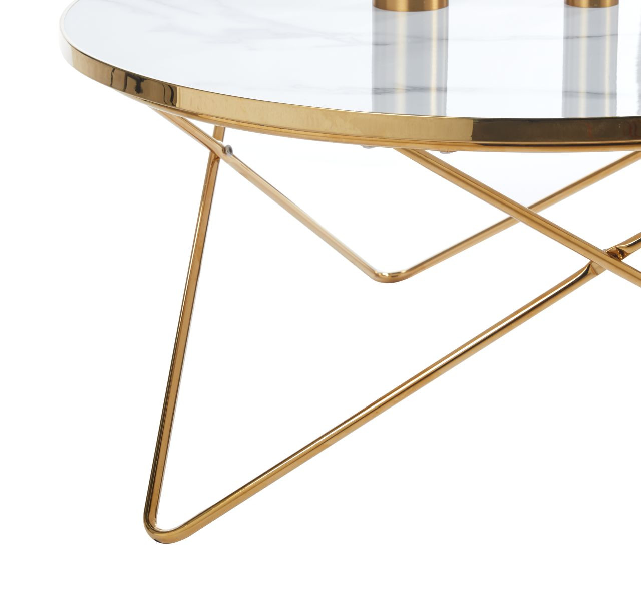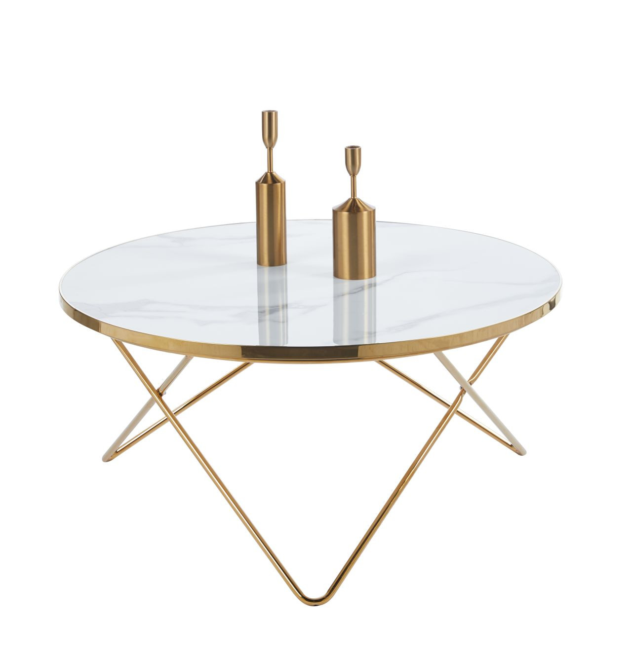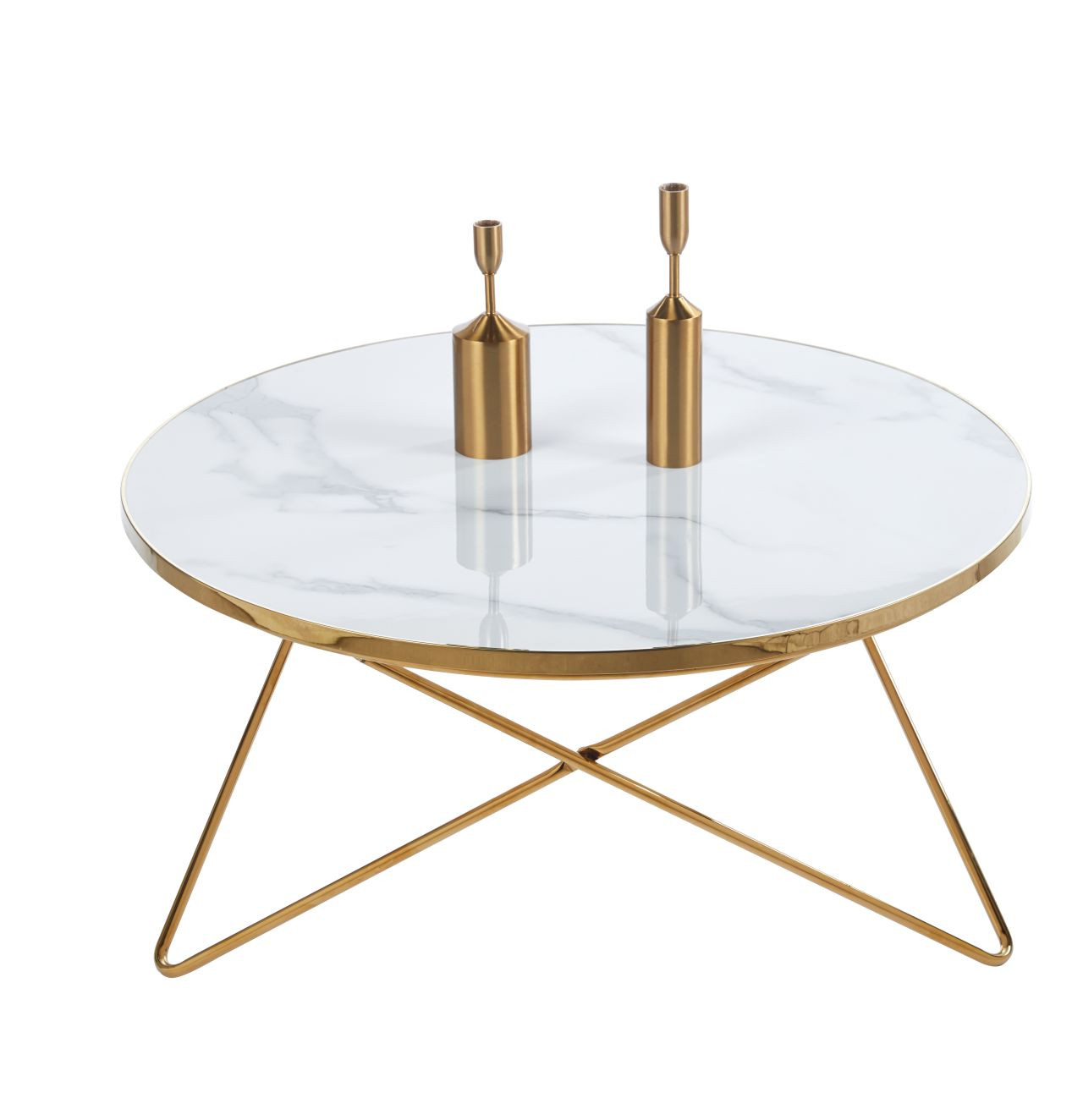Table basse ronde Ø80 cm avec plateau aspect marbre blanc et pied doré croisé. Élégante, lumineuse et facile à intégrer dans un intérieur moderne.