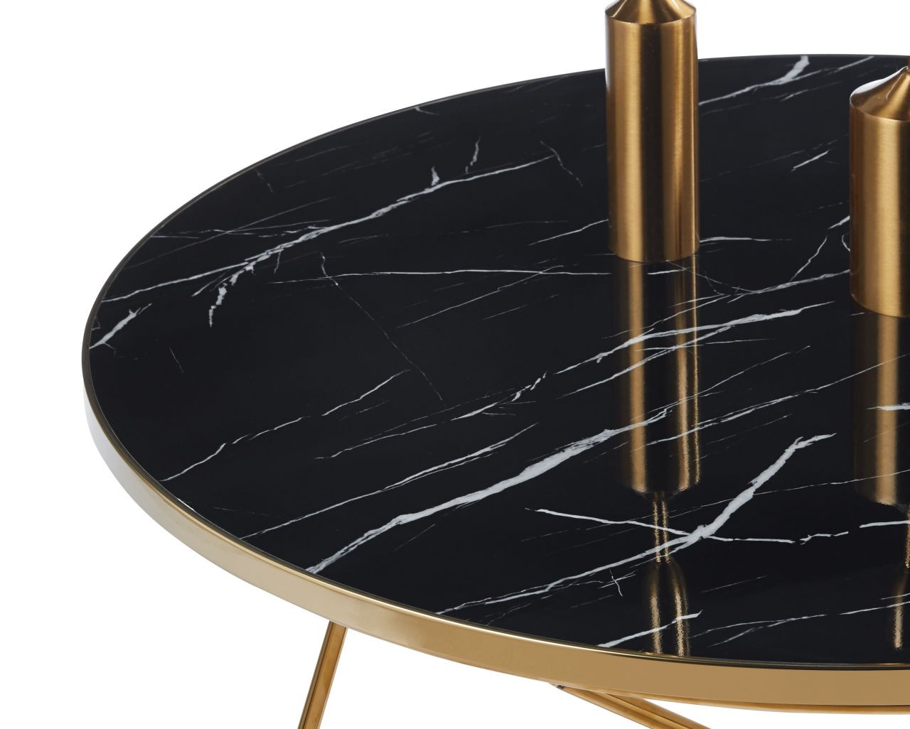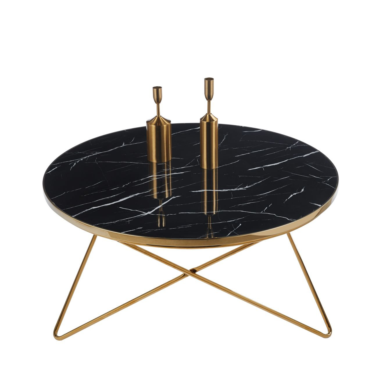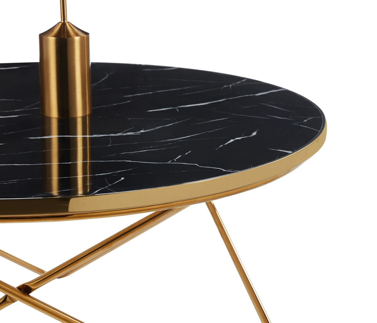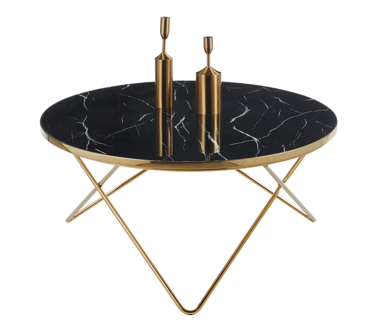 Table basse ronde Golddeco 80 cm avec plateau aspect marbre noir et piètement doré croisé. Idéale pour un salon raffiné et tendance.