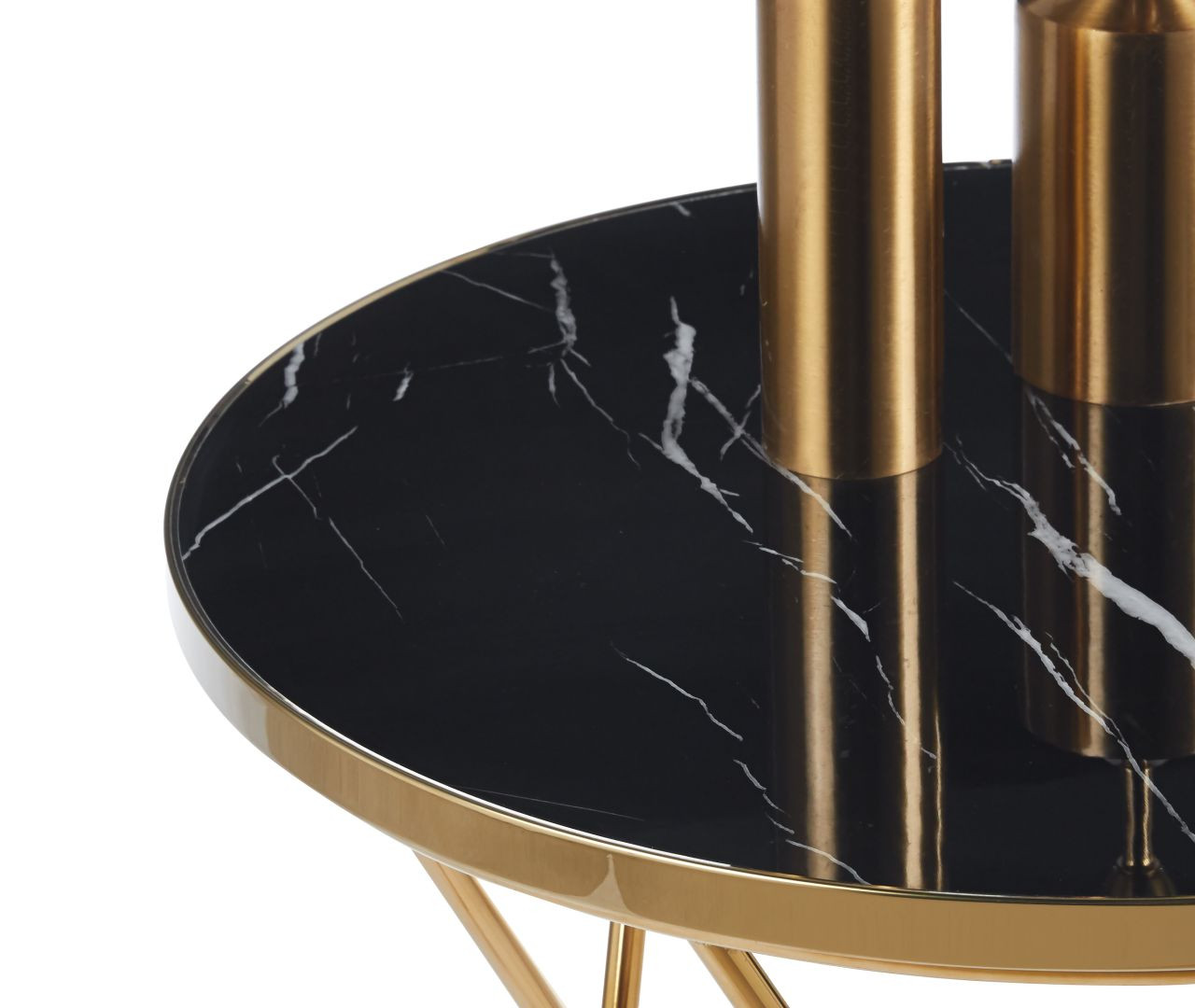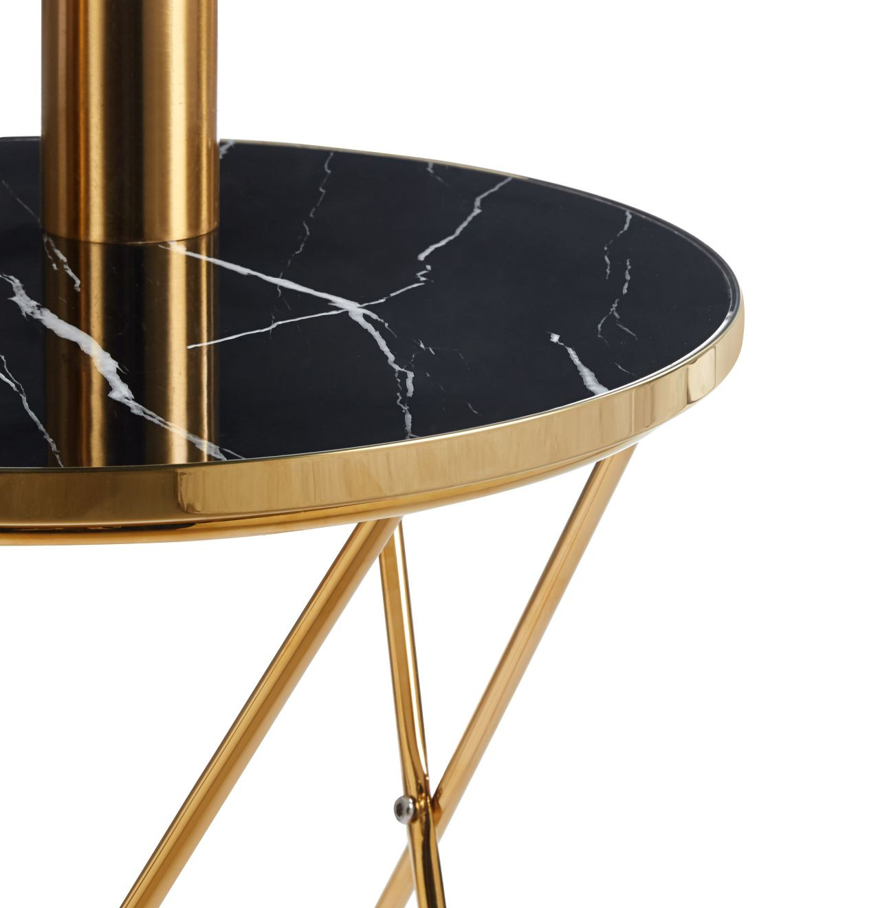 Table d’appoint Golddeco 50 cm avec plateau aspect marbre noir et structure métal doré. Parfaite en bout de canapé ou table d’appoint déco.