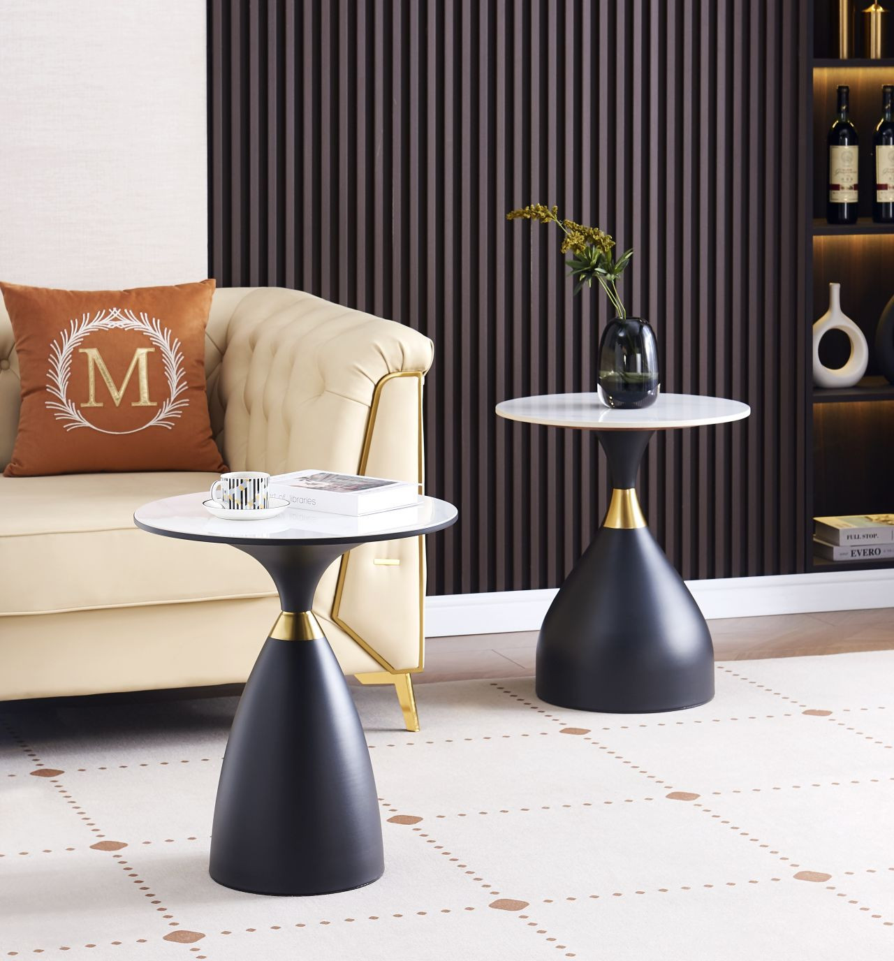 Table d’appoint design ConeMarbre 50 cm – aspect marbre blanc, base conique noire avec détail doré. Parfaite en bout de canapé. Hauteur 56 cm.