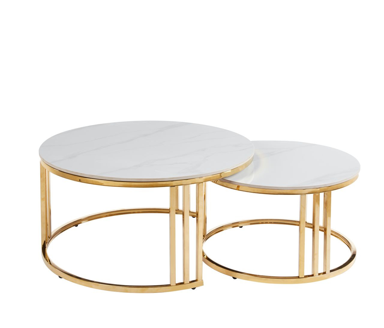 Craquez pour ce lot de 2 tables basses gigognes rondes au design raffiné, alliant marbre blanc et structure dorée brillante. Leur format empilable permet un agencement intelligent et modulable selon votre espace.