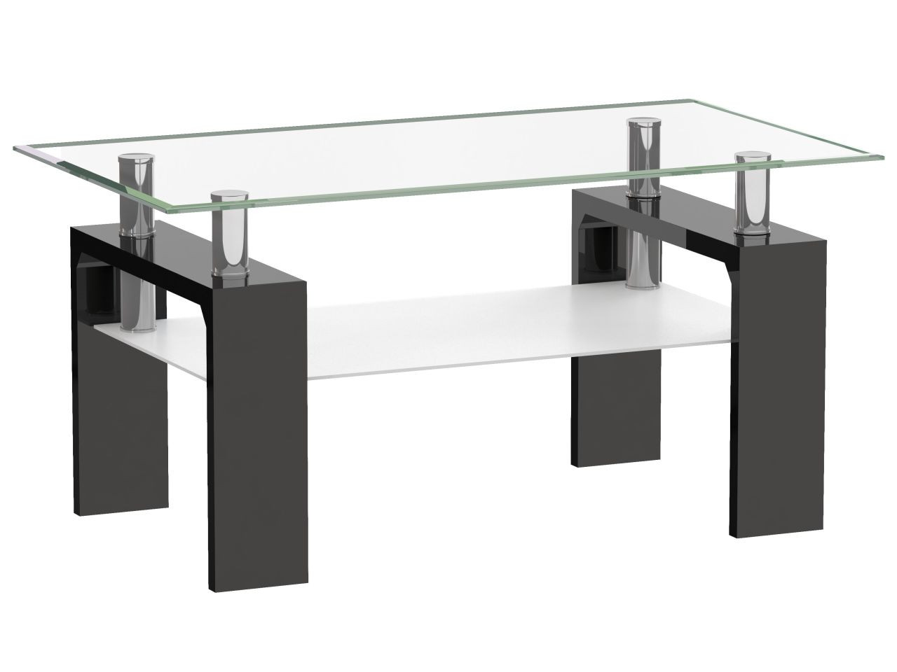 Table basse 110x60 cm avec pieds en aspect laqué noir, plateau en verre trempé 8 mm, étagère blanche, montage rapide, design moderne.