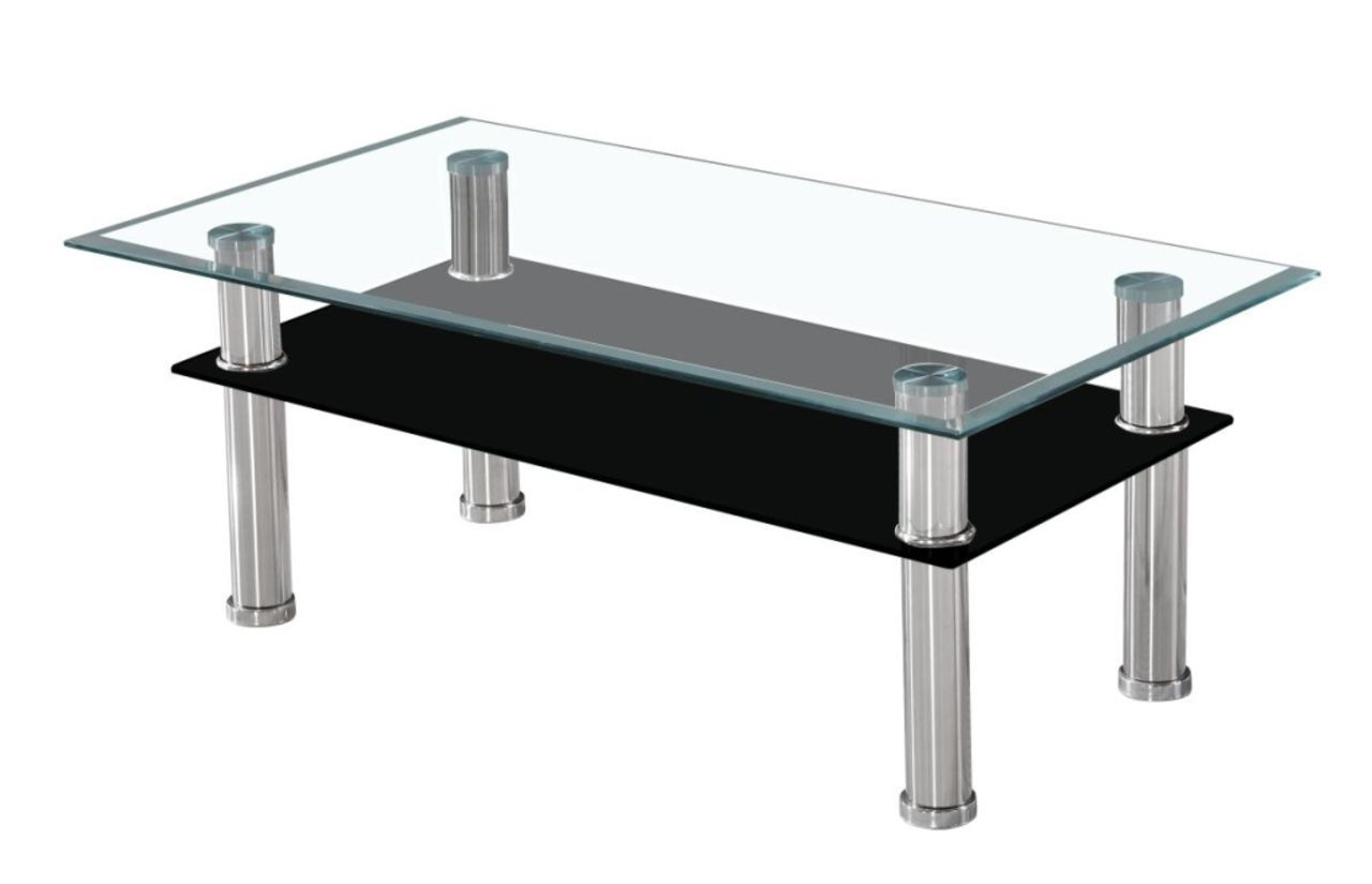 Table basse rectangulaire avec plateau supérieur en verre transparent et étagère inférieure noire. Pieds en inox design – idéale pour salon moderne.
