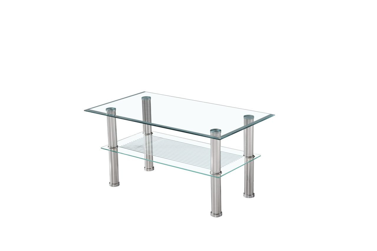 Le double plateau offre une surface utile supplémentaire pour ranger vos magazines, télécommandes ou objets décoratifs. Le verre transparent allège visuellement l’espace, tout en apportant une finition brillante et chic.