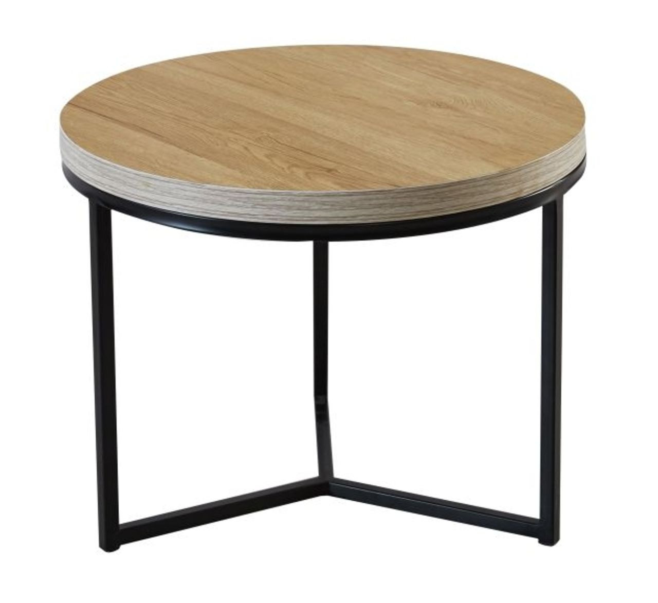 Table basse ronde avec plateau aspect chêne naturel et structure noire – un design sobre et chaleureux pour tous les intérieurs.