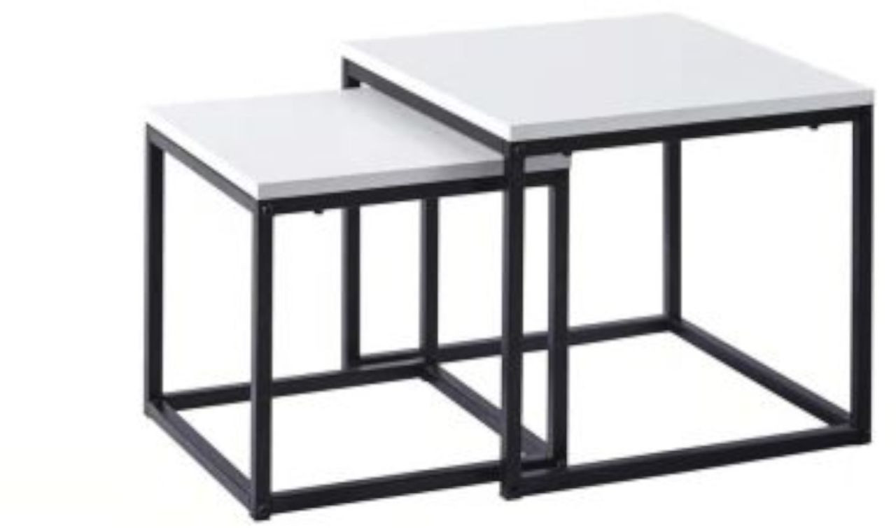 Lignes droites, esprit moderne : lot de 2 tables carrées gigognes avec plateau aspect blanc et structure noire en acier. Design fonctionnel & esthétique.