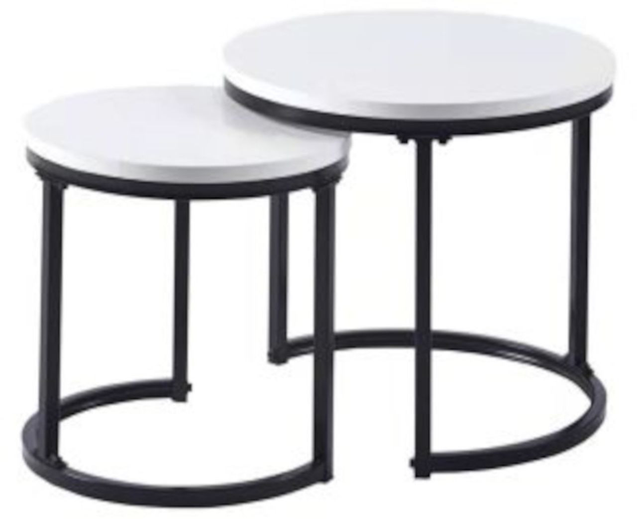Lot de 2 tables gigognes RONDA avec plateau rond en aspect blanc et pieds noirs en métal thermolaqué. Design contemporain, empilables, gain de place.
