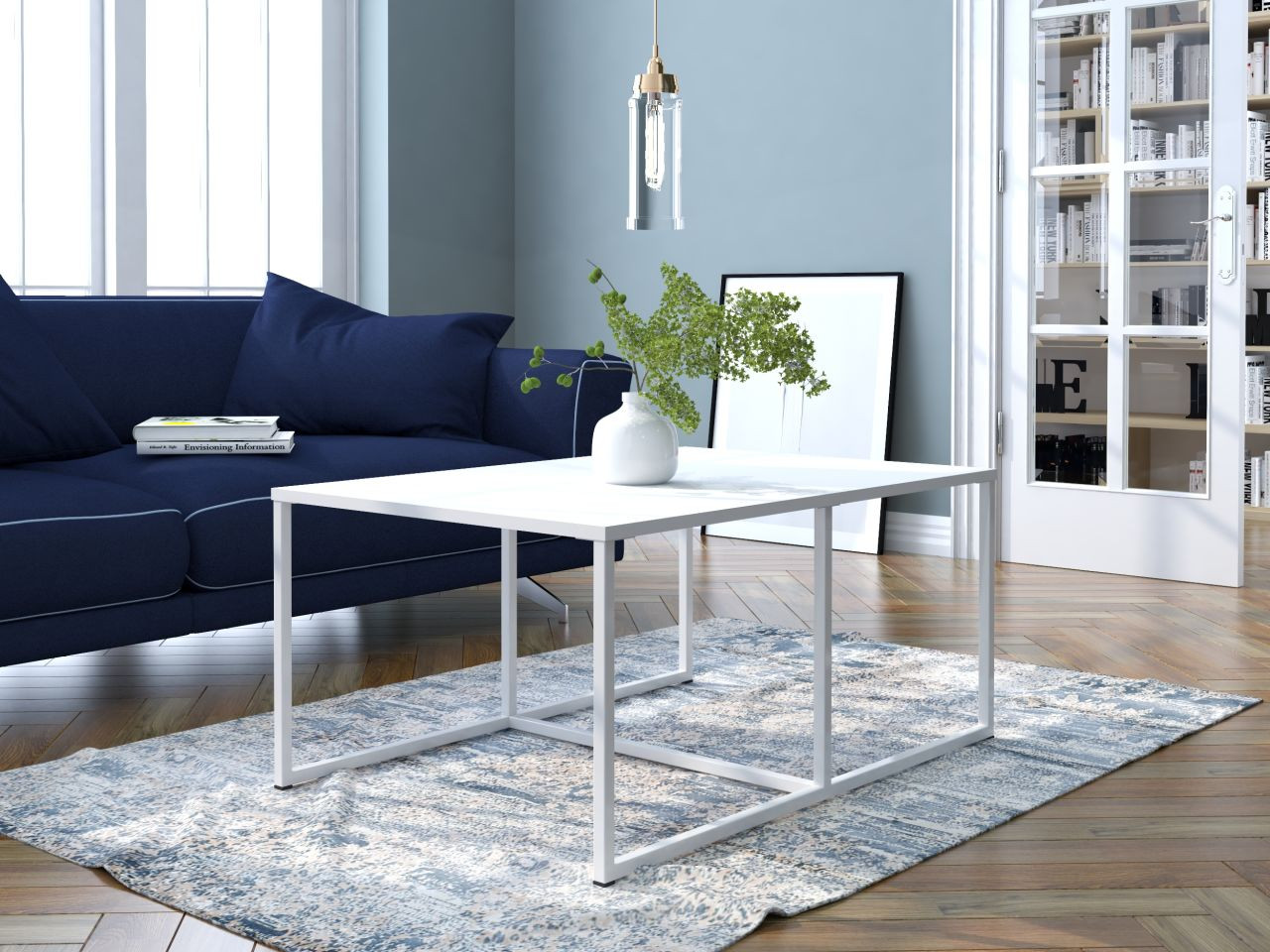 Table basse rectangulaire blanche Golddeco au design épuré. Plateau aspect mélaminé blanc et structure en métal blanc mat.