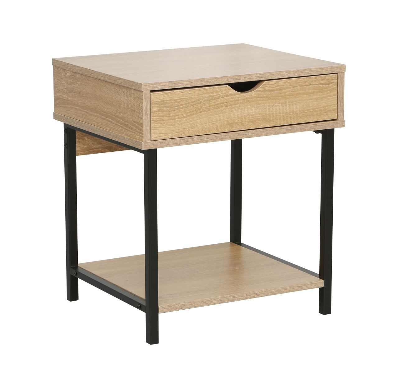La table de chevet Golddeco aspect chêne naturel séduit par son design industriel et minimaliste. Sa structure en métal noir contraste élégamment avec le bois clair pour un rendu moderne et chaleureux. Dotée d’un tiroir et d’une tablette inférieure, elle allie praticité et style.
