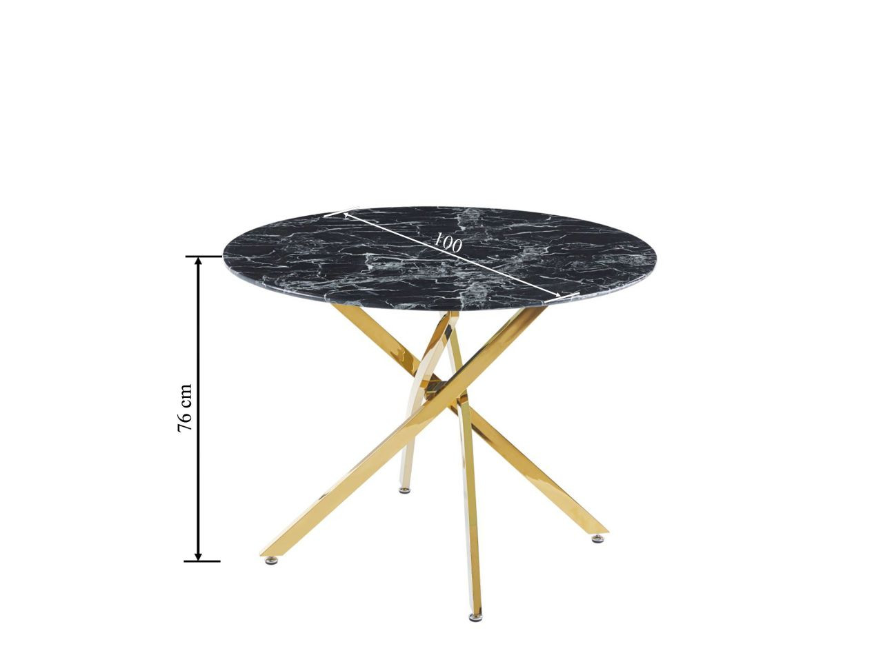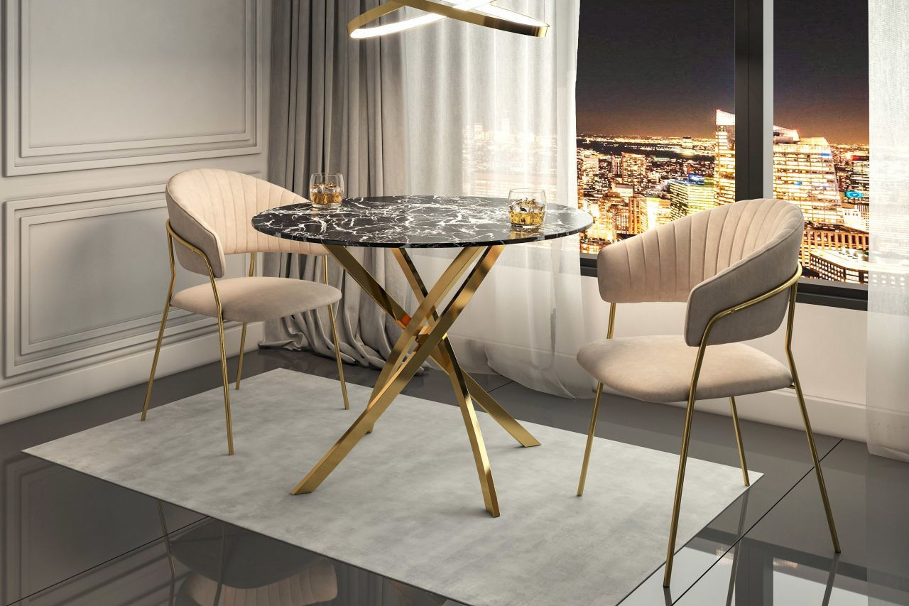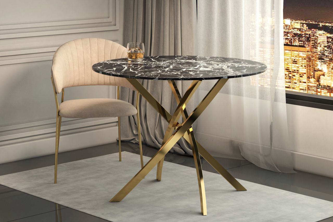La Table Ronde Imperia Golddeco marie l’élégance du marbre noir à la brillance du métal doré. Son plateau effet marbre, en verre trempé raffiné, repose sur un pied croisé doré au design sculptural.